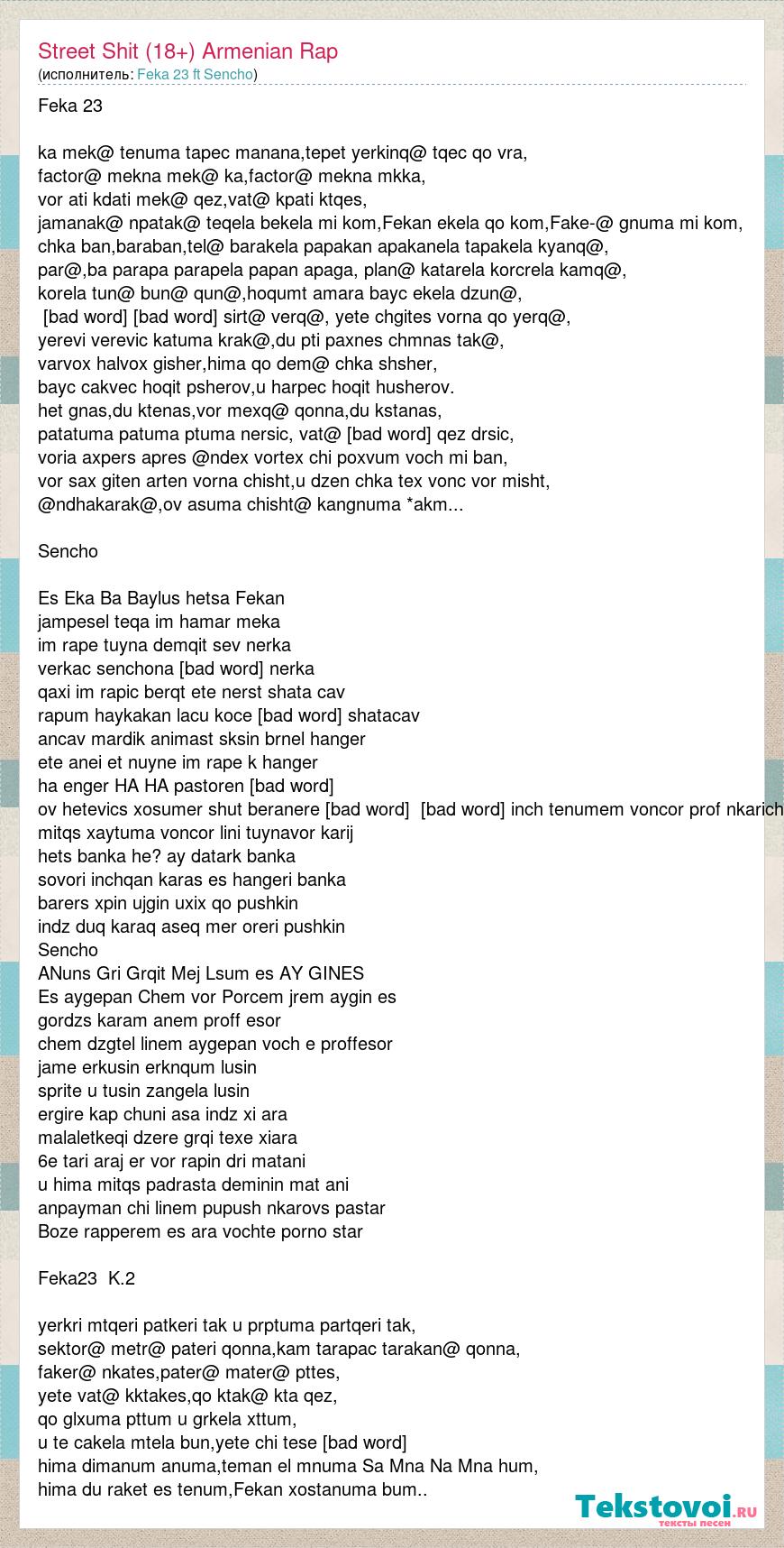 Feka 23 ka mek@ tenuma tapec manana,tepet yerkinq@ tqec qo vra, factor@ mekna mek@ ka,factor@ mekna mkka, vor ati kdati mek@ qez,vat@ kpati ktqes, jamanak@ npatak@ teqela bekela mi kom,Fekan ekela qo kom,Fake-@ gnuma mi kom, chka ban,baraban,tel@ barakela papakan apakanela tapakela kyanq@, par@,ba parapa parapela papan apaga, plan@ katarela korcrela kamq@, korela tun@ bun@ qun@,hoqumt amara bayc ekela dzun@, [bad word] qrqruma sirt@ verq@, yete chgites vorna qo yerq@, yerevi verevic katuma krak@,du pti paxnes chmnas tak@, varvox halvox gisher,hima qo dem@ chka shsher, bayc cakvec hoqit psherov,u harpec hoqit husherov. het gnas,du ktenas,vor mexq@ qonna,du kstanas, patatuma patuma ptuma nersic, vat@ [bad word] qez drsic, voria axpers apres @ndex vortex chi poxvum voch mi ban, vor sax giten arten vorna chisht,u dzen chka tex vonc vor misht, @ndhakarak@,ov asuma chisht@ kangnuma *akm... Sencho Es Eka Ba Baylus hetsa Fekan jampesel teqa im hamar meka im rape tuyna demqit sev nerka verkac senchona [bad word] nerka qaxi im rapic berqt ete nerst shata cav rapum haykakan lacu koce [bad word] shatacav ancav mardik animast sksin brnel hanger ete anei et nuyne im rape k hanger ha enger HA HA pastoren [bad word] ov hetevics xosumer shut beranere [bad word] [bad word] inch tenumem voncor prof nkarich mitqs xaytuma voncor lini tuynavor karij hets banka he? ay datark banka sovori inchqan karas es hangeri banka barers xpin ujgin uxix qo pushkin indz duq karaq aseq mer oreri pushkin Sencho ANuns Gri Grqit Mej Lsum es AY GINES Es aygepan Chem vor Porcem jrem aygin es gordzs karam anem proff esor chem dzgtel linem aygepan voch e proffesor jame erkusin erknqum lusin sprite u tusin zangela lusin ergire kap chuni asa indz xi ara malaletkeqi dzere grqi texe xiara 6e tari araj er vor rapin dri matani u hima mitqs padrasta deminin mat ani anpayman chi linem pupush nkarovs pastar Boze rapperem es ara vochte porno star Feka23 K.2 yerkri mtqeri patkeri tak u prptuma partqeri tak, sektor@ metr@ pateri qonna,kam tarapac tarakan@ qonna, faker@ nkates,pater@ mater@ pttes, yete vat@ kktakes,qo ktak@ kta qez, qo glxuma pttum u grkela xttum, u te cakela mtela bun,yete chi tese [bad word] hima dimanum anuma,teman el mnuma Sa Mna Na Mna hum, hima du raket es tenum,Fekan xostanuma bum..