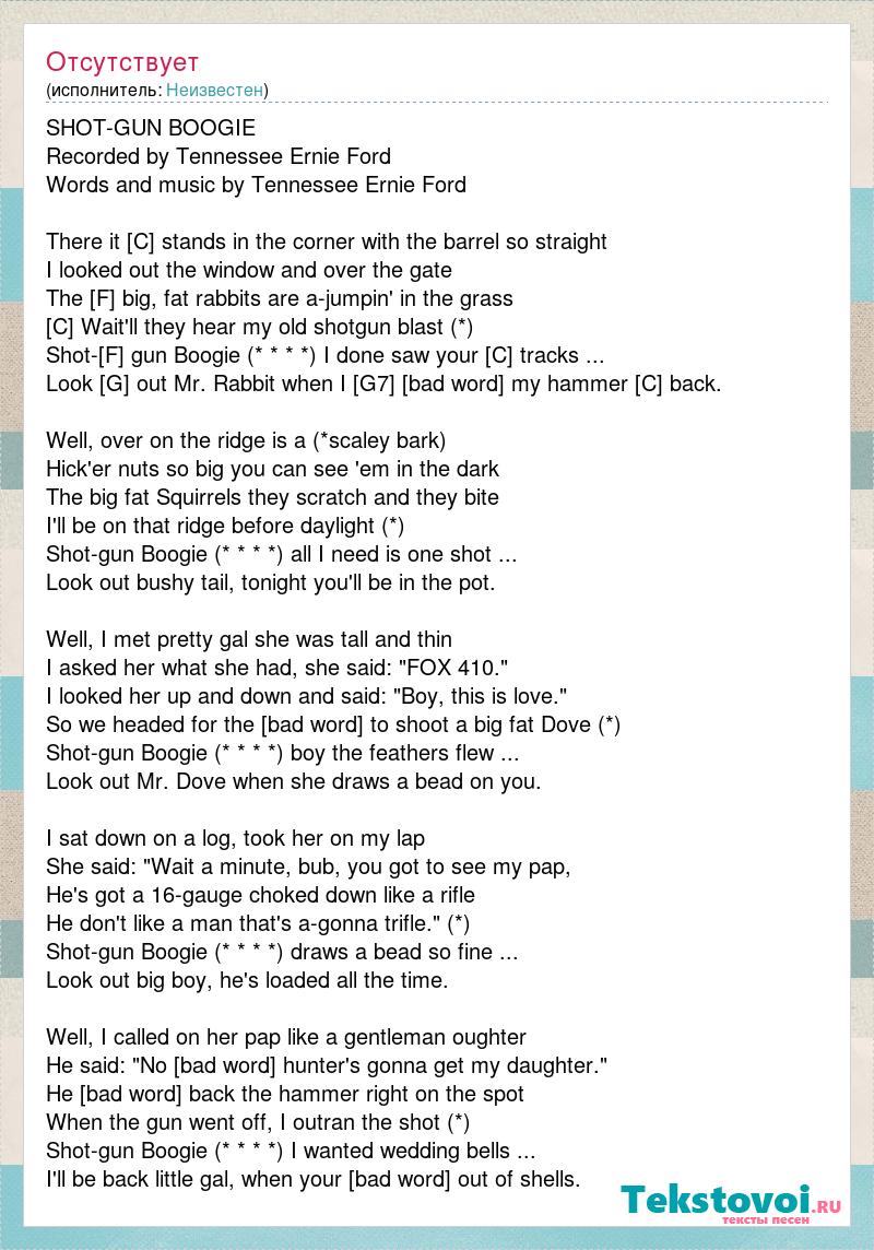 SHOT-GUN BOOGIE Recorded by Tennessee Ernie Ford Words and music by Tennessee Ernie Ford There it [C] stands in the corner with the barrel so straight I looked out the window and over the gate The [F] big, fat rabbits are a-jumpin' in the grass [C] Wait'll they hear my old shotgun blast (*) Shot-[F] gun Boogie (* * * *) I done saw your [C] tracks ... Look [G] out Mr. Rabbit when I [G7] [bad word] my hammer [C] back. Well, over on the ridge is a (*scaley bark) Hick'er nuts so big you can see 'em in the dark The big fat Squirrels they scratch and they bite I'll be on that ridge before daylight (*) Shot-gun Boogie (* * * *) all I need is one shot ... Look out bushy tail, tonight you'll be in the pot. Well, I met pretty gal she was tall and thin I asked her what she had, she said: "FOX 410." I looked her up and down and said: "Boy, this is love." So we headed for the brush to shoot a big fat Dove (*) Shot-gun Boogie (* * * *) boy the feathers flew ... Look out Mr. Dove when she draws a bead on you. I sat down on a log, took her on my lap She said: "Wait a minute, bub, you got to see my pap, He's got a 16-gauge choked down like a rifle He don't like a man that's a-gonna trifle." (*) Shot-gun Boogie (* * * *) draws a bead so fine ... Look out big boy, he's loaded all the time. Well, I called on her pap like a gentleman oughter He said: "No brush hunter's gonna get my daughter." He [bad word] back the hammer right on the spot When the gun went off, I outran the shot (*) Shot-gun Boogie (* * * *) I wanted wedding bells ... I'll be back little gal, when your pappy runs out of shells.