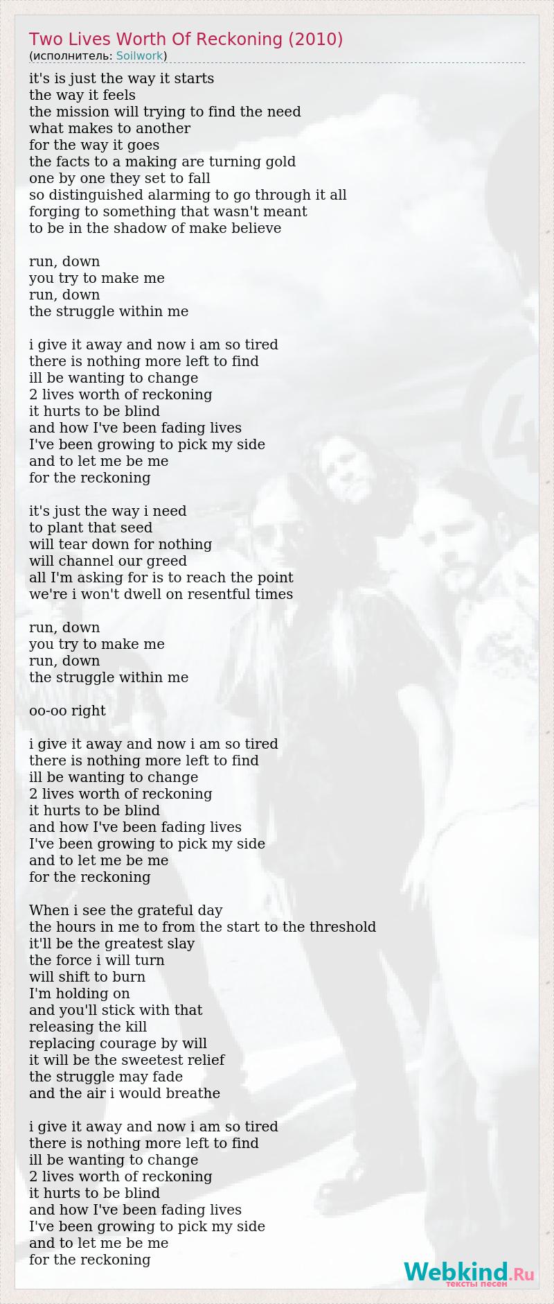 it's is just the way it starts the way it feels the mission will trying to find the need what makes to another for the way it goes the facts to a making are turning gold one by one they set to fall so distinguished alarming to go through it all forging to something that wasn't meant to be in the shadow of make believe run, down you try to make me run, down the struggle within me i give it away and now i am so tired there is nothing more left to find ill be wanting to change 2 lives worth of reckoning it hurts to be blind and how I've been fading lives I've been growing to pick my side and to let me be me for the reckoning it's just the way i need to plant that seed will tear down for nothing will channel our greed all I'm asking for is to reach the point we're i won't dwell on resentful times run, down you try to make me run, down the struggle within me oo-oo right i give it away and now i am so tired there is nothing more left to find ill be wanting to change 2 lives worth of reckoning it hurts to be blind and how I've been fading lives I've been growing to pick my side and to let me be me for the reckoning When i see the grateful day the hours in me to from the start to the threshold it'll be the greatest slay the force i will turn will shift to burn I'm holding on and you'll stick with that releasing the kill replacing courage by will it will be the sweetest relief the struggle may fade and the air i would breathe i give it away and now i am so tired there is nothing more left to find ill be wanting to change 2 lives worth of reckoning it hurts to be blind and how I've been fading lives I've been growing to pick my side and to let me be me for the reckoning