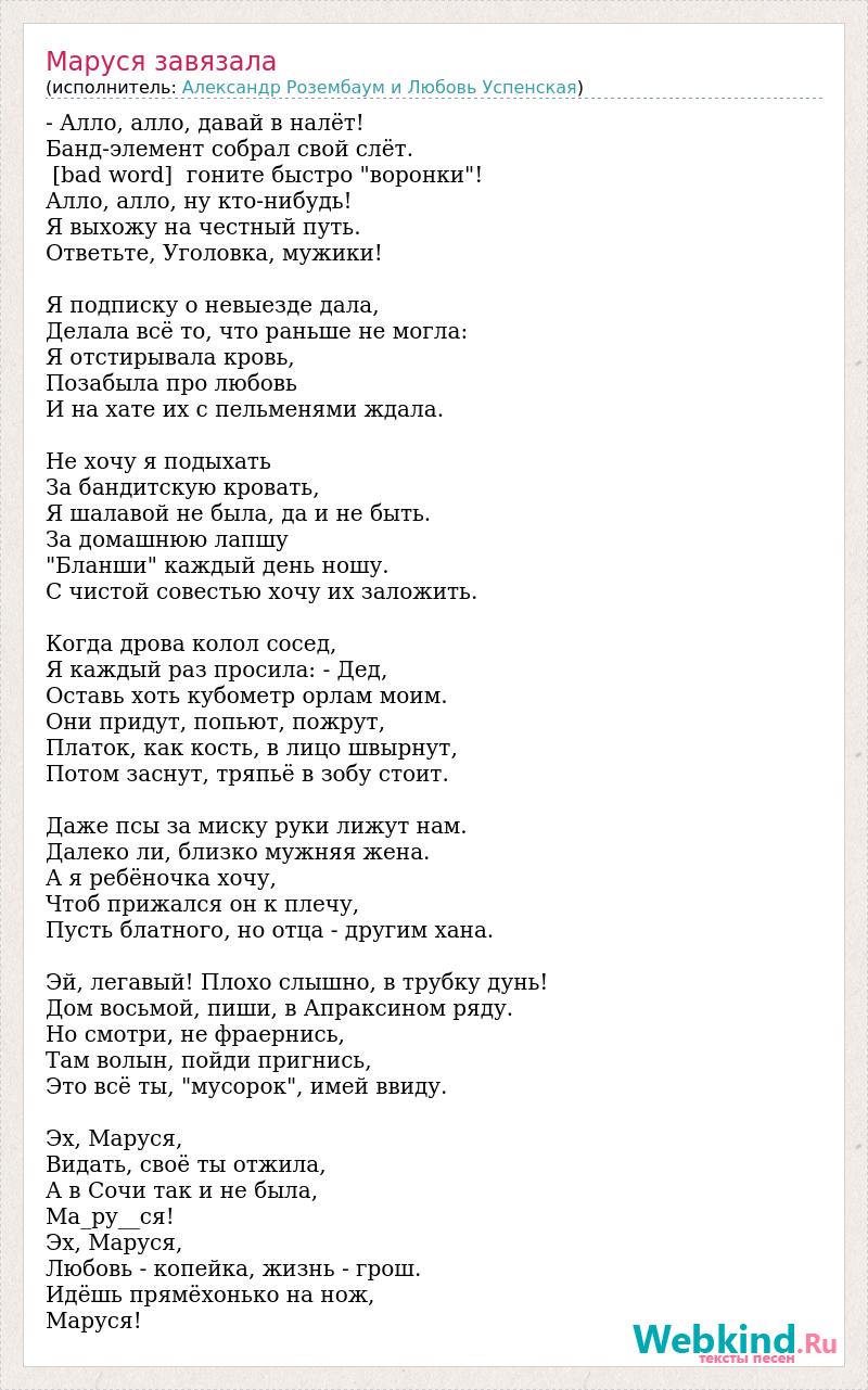 - Алло, алло, давай в налёт! Банд-элемент собрал свой слёт. [bad word] гоните быстро "воронки"! Алло, алло, ну кто-нибудь! Я выхожу на честный путь. Ответьте, Уголовка, мужики! Я подписку о невыезде дала, Делала всё то, что раньше не могла: Я отстирывала кровь, Позабыла про любовь И на хате их с пельменями ждала. Не хочу я подыхать За бандитскую кровать, Я шалавой не была, да и не быть. За домашнюю лапшу "Бланши" каждый день ношу. С чистой совестью хочу их заложить. Когда дрова колол сосед, Я каждый раз просила: - Дед, Оставь хоть кубометр орлам моим. Они придут, попьют, пожрут, Платок, как кость, в лицо швырнут, Потом заснут, тряпьё в зобу стоит. Даже псы за миску руки лижут нам. Далеко ли, близко мужняя жена. А я ребёночка хочу, Чтоб прижался он к плечу, Пусть блатного, но отца - другим хана. Эй, легавый! Плохо слышно, в трубку дунь! Дом восьмой, пиши, в Апраксином ряду. Но смотри, не фраернись, Там волын, пойди пригнись, Это всё ты, "мусорок", имей ввиду. Эх, Маруся, Видать, своё ты отжила, А в Сочи так и не была, Ма_ру__ся! Эх, Маруся, Любовь - копейка, жизнь - грош. Идёшь прямёхонько на нож, Маруся!