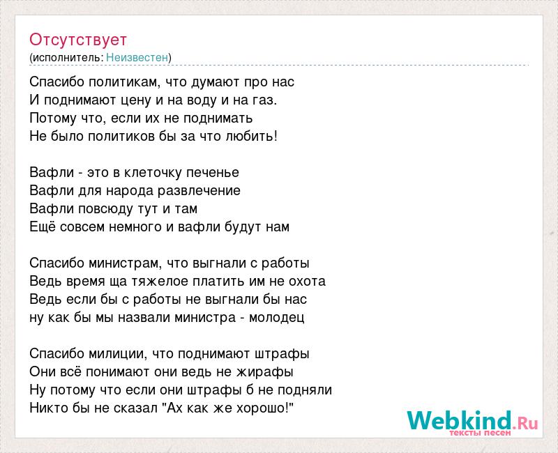 Спасибо политикам, что думают про нас И поднимают цену и на воду и на газ. Потому что, если их не поднимать Не было политиков бы за что любить! Вафли - это в клеточку печенье Вафли для народа развлечение Вафли повсюду тут и там Ещё совсем немного и вафли будут нам Спасибо министрам, что выгнали с работы Ведь время ща тяжелое платить им не охота Ведь если бы с работы не выгнали бы нас ну как бы мы назвали министра - молодец Спасибо милиции, что поднимают штрафы Они всё понимают они ведь не жирафы Ну потому что если они штрафы б не подняли Никто бы не сказал "Ах как же хорошо!"