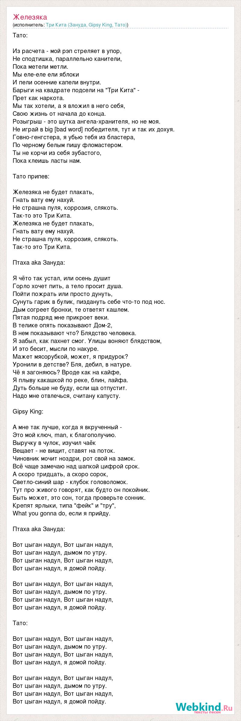 Тато: Из расчета - мой рэп стреляет в упор, Не сподтишка, параллельно канители, Пока метели метли. Мы еле-еле ели яблоки И пели осенние капели внутри. Барыги на квадрате подсели на "Три Кита" - Прет как наркота. Мы так хотели, а я вложил в него себя, Свою жизнь от начала до конца. Розыгрыш - это шутка ангела-хранителя, но не моя. Не играй в big [bad word] победителя, тут и так их дохуя. Говно-генгстера, я убью тебя из бластера, По черному белым пишу фломастером. Ты не корчи из себя зубастого, Пока клеишь ласты нам. Тато припев: Железяка не будет плакать, Гнать вату ему нахуй. Не страшна пуля, коррозия, слякоть. Так-то это Три Кита. Железяка не будет плакать, Гнать вату ему нахуй. Не страшна пуля, коррозия, слякоть. Так-то это Три Кита. Птаха аkа Зануда: Я чёто так устал, или осень душит Горло хочет пить, а тело просит душа. Пойти пожрать или просто дунуть, Сунуть гарик в булик, пиздануть себе что-то под нос. Дым согреет бронхи, те ответят кашлем. Пятая подряд мне прикроет веки. В телике опять показывают Дом-2, В нем показывают что? Блядство человека. Я забыл, как пахнет смог. Улицы воняют блядством, И это бесит, мысли по накуре. Мажет мясорубкой, может, я придурок? Уронили в детстве? Бля, дебил, в натуре. Чё я загоняюсь? Вроде как на кайфе, Я плыву какашкой по реке, блин, лайфа. Дуть больше не буду, если ща отпустит. Надо мне отвлечься, считану капусту. Gipsy King: А мне так лучше, когда я вкрученный - Это мой ключ, man, к благополучию. Выручку в чулок, изучил чаёк Вещает - не вищит, ставят на поток. Чиновник мочит ноздри, рот свой на замок. Всё чаще замечаю над шапкой цифрой срок. А скоро тридцать, а скоро сорок, Светло-синий шар - клубок головоломок. Тут про живого говорят, как будто он покойник. Быть может, это сон, тогда проверьте сонник. Крепят ярлыки, типа "фейк" и "тру", What you gonna do, если я прийду. Птаха аkа Зануда: Вот цыган надул, Вот цыган надул, Вот цыган надул, дымом по утру. Вот цыган надул, Вот цыган надул, Вот цыган надул, я домой пойду. Вот цыган надул, Вот цыган надул, Вот цыган надул, дымом по утру. Вот цыган надул, Вот цыган надул, Вот цыган надул, я домой пойду. Тато: Вот цыган надул, Вот цыган надул, Вот цыган надул, дымом по утру. Вот цыган надул, Вот цыган надул, Вот цыган надул, я домой пойду. Вот цыган надул, Вот цыган надул, Вот цыган надул, дымом по утру. Вот цыган надул, Вот цыган надул, Вот цыган надул, я домой пойду.