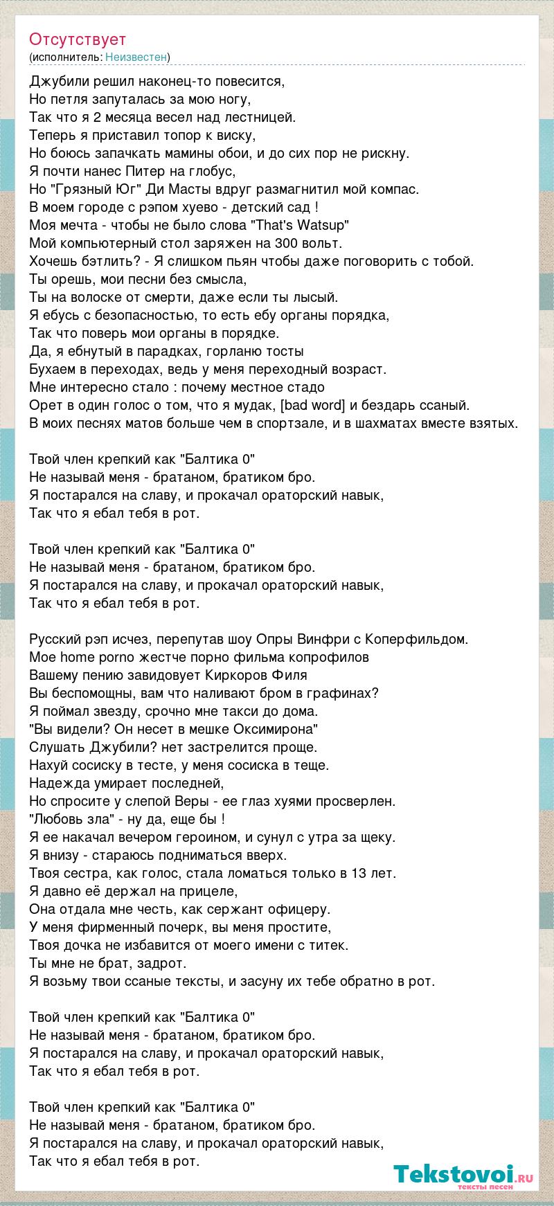 Джубили решил наконец-то повесится, Но петля запуталась за мою ногу, Так что я 2 месяца весел над лестницей. Теперь я приставил топор к виску, Но боюсь запачкать мамины обои, и до сих пор не рискну. Я почти нанес Питер на глобус, Но "Грязный Юг" Ди Масты вдруг размагнитил мой компас. В моем городе с рэпом хуево - детский сад ! Моя мечта - чтобы не было слова "That's Watsup" Мой компьютерный стол заряжен на 300 вольт. Хочешь бэтлить? - Я слишком пьян чтобы даже поговорить с тобой. Ты орешь, мои песни без смысла, Ты на волоске от смерти, даже если ты лысый. Я ебусь с безопасностью, то есть ебу органы порядка, Так что поверь мои органы в порядке. Да, я ебнутый в парадках, горланю тосты Бухаем в переходах, ведь у меня переходный возраст. Мне интересно стало : почему местное стадо Орет в один голос о том, что я мудак, [bad word] и бездарь ссаный. В моих песнях матов больше чем в спортзале, и в шахматах вместе взятых. Твой член крепкий как "Балтика 0" Не называй меня - братаном, братиком бро. Я постарался на славу, и прокачал ораторский навык, Так что я ебал тебя в рот. Твой член крепкий как "Балтика 0" Не называй меня - братаном, братиком бро. Я постарался на славу, и прокачал ораторский навык, Так что я ебал тебя в рот. Русский рэп исчез, перепутав шоу Опры Винфри с Коперфильдом. Мое home porno жестче порно фильма копрофилов Вашему пению завидовует Киркоров Филя Вы беспомощны, вам что наливают бром в графинах? Я поймал звезду, срочно мне такси до дома. "Вы видели? Он несет в мешке Оксимирона" Слушать Джубили? нет застрелится проще. Нахуй сосиску в тесте, у меня сосиска в теще. Надежда умирает последней, Но спросите у слепой Веры - ее глаз хуями просверлен. "Любовь зла" - ну да, еще бы ! Я ее накачал вечером героином, и сунул с утра за щеку. Я внизу - стараюсь подниматься вверх. Твоя сестра, как голос, стала ломаться только в 13 лет. Я давно её держал на прицеле, Она отдала мне честь, как сержант офицеру. У меня фирменный почерк, вы меня простите, Твоя дочка не избавится от моего имени с титек. Ты мне не брат, задрот. Я возьму твои ссаные тексты, и засуну их тебе обратно в рот. Твой член крепкий как "Балтика 0" Не называй меня - братаном, братиком бро. Я постарался на славу, и прокачал ораторский навык, Так что я ебал тебя в рот. Твой член крепкий как "Балтика 0" Не называй меня - братаном, братиком бро. Я постарался на славу, и прокачал ораторский навык, Так что я ебал тебя в рот.