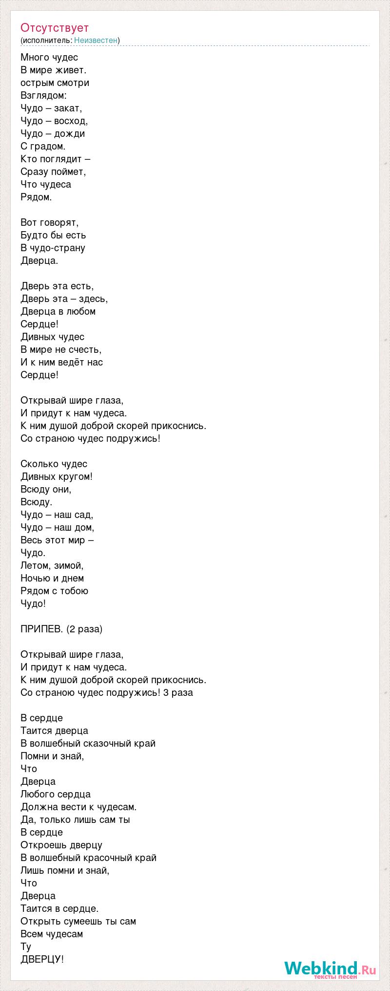 Много чудес В мире живет. острым смотри Взглядом: Чудо – закат, Чудо – восход, Чудо – дожди С градом. Кто поглядит – Сразу поймет, Что чудеса Рядом. Вот говорят, Будто бы есть В чудо-страну Дверца. Дверь эта есть, Дверь эта – здесь, Дверца в любом Сердце! Дивных чудес В мире не счесть, И к ним ведёт нас Сердце! Открывай шире глаза, И придут к нам чудеса. К ним душой доброй скорей прикоснись. Со страною чудес подружись! Сколько чудес Дивных кругом! Всюду они, Всюду. Чудо – наш сад, Чудо – наш дом, Весь этот мир – Чудо. Летом, зимой, Ночью и днем Рядом с тобою Чудо! ПРИПЕВ. (2 раза) Открывай шире глаза, И придут к нам чудеса. К ним душой доброй скорей прикоснись. Со страною чудес подружись! 3 раза В сердце Таится дверца В волшебный сказочный край Помни и знай, Что Дверца Любого сердца Должна вести к чудесам. Да, только лишь сам ты В сердце Откроешь дверцу В волшебный красочный край Лишь помни и знай, Что Дверца Таится в сердце. Открыть сумеешь ты сам Всем чудесам Ту ДВЕРЦУ!