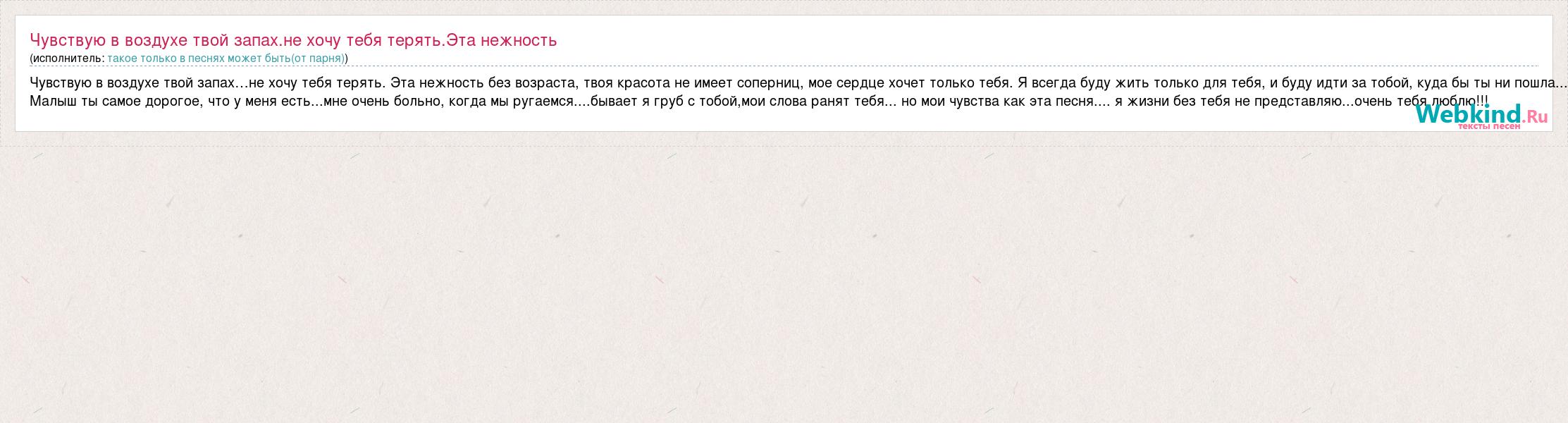 Главная→Исполнители→Такое только в песнях может быть(от парня)→Чувствую в воздухе твой запах.не хочу тебя терять.Эта нежность