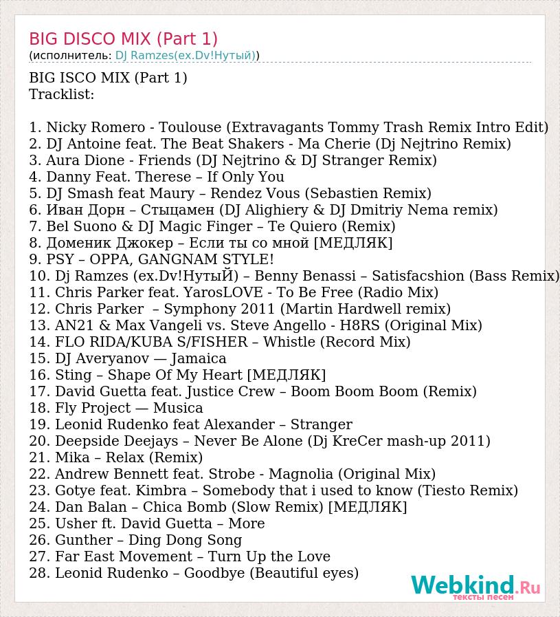 BIG ISCO MIX (Part 1) Tracklist: 1. Nicky Romero - Toulouse (Extravagants Tommy Trash Remix Intro Edit) 2. DJ Antoine feat. The Beat Shakers - Ma Cherie (Dj Nejtrino Remix) 3. Aura Dione - Friends (DJ Nejtrino & DJ Stranger Remix) 4. Danny Feat. Therese – If Only You 5. DJ Smash feat Maury – Rendez Vous (Sebastien Remix) 6. Иван Дорн – Стыцамен (DJ Alighiery & DJ Dmitriy Nema remix) 7. Bel Suono & DJ Magic Finger – Te Quiero (Remix) 8. Доменик Джокер – Если ты со мной [МЕДЛЯК] 9. PSY – OPPA, GANGNAM STYLE! 10. Dj Ramzes (ex.Dv!НутыЙ) – Benny Benassi – Satisfacshion (Bass Remix) 11. Chris Parker feat. YarosLOVE - To Be Free (Radio Mix) 12. Chris Parker – Symphony 2011 (Martin Hardwell remix) 13. AN21 & Max Vangeli vs. Steve Angello - H8RS (Original Mix) 14. FLO RIDA/KUBA S/FISHER – Whistle (Record Mix) 15. DJ Averyanov — Jamaica 16. Sting – Shape Of My Heart [МЕДЛЯК] 17. David Guetta feat. Justice Crew – Boom Boom Boom (Remix) 18. Fly Project — Musica 19. Leonid Rudenko feat Alexander – Stranger 20. Deepside Deejays – Never Be Alone (Dj KreCer mash-up 2011) 21. Mika – Relax (Remix) 22. Andrew Bennett feat. Strobe - Magnolia (Original Mix) 23. Gotye feat. Kimbra – Somebody that i used to know (Tiesto Remix) 24. Dan Balan – Chica Bomb (Slow Remix) [МЕДЛЯК] 25. Usher ft. David Guetta – More 26. Gunther – Ding Dong Song 27. Far East Movement – Turn Up the Love 28. Leonid Rudenko – Goodbye (Beautiful eyes)
