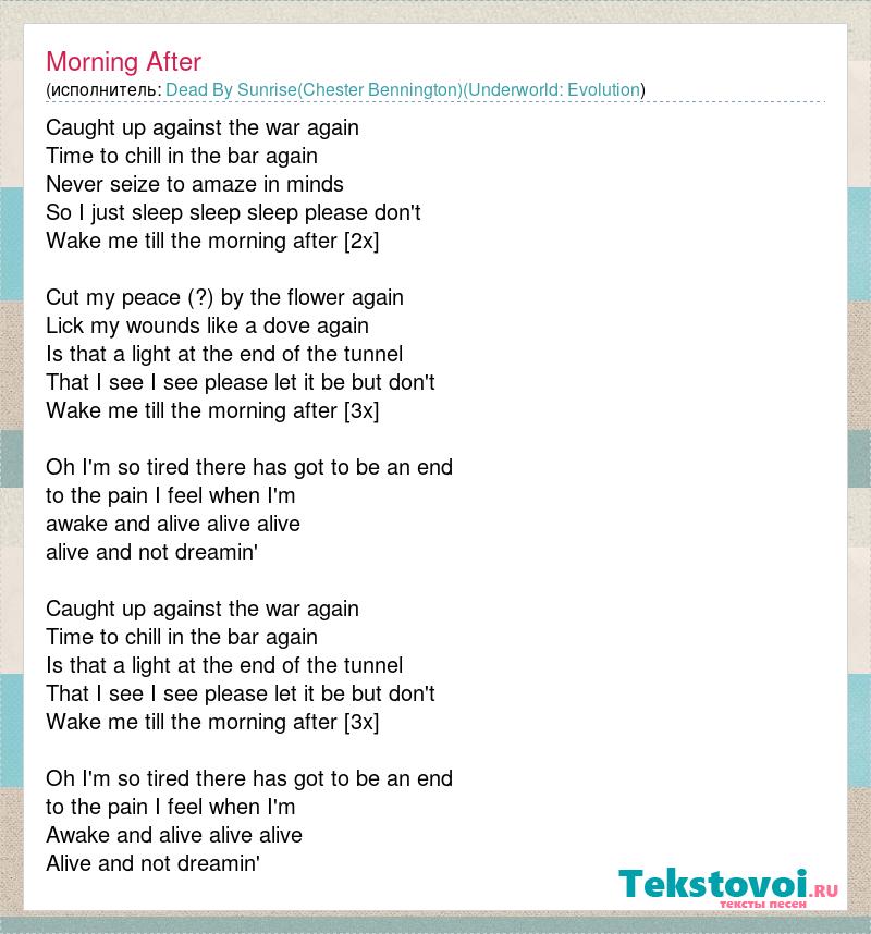 Caught up against the war again Time to chill in the bar again Never seize to amaze in minds So I just sleep sleep sleep please don't Wake me till the morning after [2x] Cut my peace (?) by the flower again Lick my wounds like a dove again Is that a light at the end of the tunnel That I see I see please let it be but don't Wake me till the morning after [3x] Oh I'm so tired there has got to be an end to the pain I feel when I'm awake and alive alive alive alive and not dreamin' Caught up against the war again Time to chill in the bar again Is that a light at the end of the tunnel That I see I see please let it be but don't Wake me till the morning after [3x] Oh I'm so tired there has got to be an end to the pain I feel when I'm Awake and alive alive alive Alive and not dreamin'
