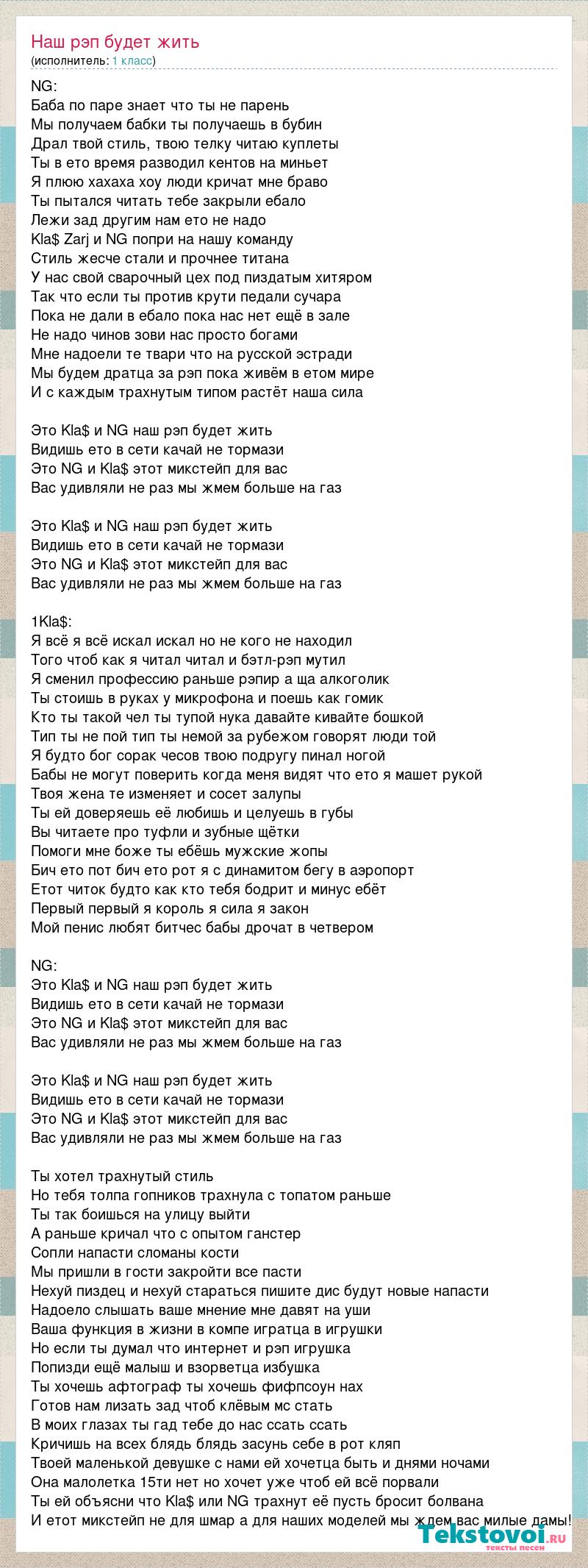 NG: Баба по паре знает что ты не парень Мы получаем бабки ты получаешь в бубин Драл твой стиль, твою телку читаю куплеты Ты в ето время разводил кентов на миньет Я плюю хахаха хоу люди кричат мне браво Ты пытался читать тебе закрыли ебало Лежи зад другим нам ето не надо Kla$ Zarj и NG попри на нашу команду Стиль жесче стали и прочнее титана У нас свой сварочный цех под пиздатым хитяром Так что если ты против крути педали сучара Пока не дали в ебало пока нас нет ещё в зале Не надо чинов зови нас просто богами Мне надоели те твари что на русской эстради Мы будем дратца за рэп пока живём в етом мире И с каждым трахнутым типом растёт наша сила Это Kla$ и NG наш рэп будет жить Видишь ето в сети качай не тормази Это NG и Kla$ этот микстейп для вас Вас удивляли не раз мы жмем больше на газ Это Kla$ и NG наш рэп будет жить Видишь ето в сети качай не тормази Это NG и Kla$ этот микстейп для вас Вас удивляли не раз мы жмем больше на газ 1Kla$: Я всё я всё искал искал но не кого не находил Того чтоб как я читал читал и бэтл-рэп мутил Я сменил профессию раньше рэпир а ща алкоголик Ты стоишь в руках у микрофона и поешь как гомик Кто ты такой чел ты тупой нука давайте кивайте бошкой Тип ты не пой тип ты немой за рубежом говорят люди той Я будто бог сорак чесов твою подругу пинал ногой Бабы не могут поверить когда меня видят что ето я машет рукой Твоя жена те изменяет и сосет залупы Ты ей доверяешь её любишь и целуешь в губы Вы читаете про туфли и зубные щётки Помоги мне боже ты ебёшь мужские жопы Бич ето пот бич ето рот я с динамитом бегу в аэропорт Етот читок будто как кто тебя бодрит и минус ебёт Первый первый я король я сила я закон Мой пенис любят битчес бабы дрочат в четвером NG: Это Kla$ и NG наш рэп будет жить Видишь ето в сети качай не тормази Это NG и Kla$ этот микстейп для вас Вас удивляли не раз мы жмем больше на газ Это Kla$ и NG наш рэп будет жить Видишь ето в сети качай не тормази Это NG и Kla$ этот микстейп для вас Вас удивляли не раз мы жмем больше на газ Ты хотел трахнутый стиль Но тебя толпа гопников трахнула с топатом раньше Ты так боишься на улицу выйти А раньше кричал что с опытом ганстер Сопли напасти сломаны кости Мы пришли в гости закройти все пасти Нехуй пиздец и нехуй стараться пишите дис будут новые напасти Надоело слышать ваше мнение мне давят на уши Ваша функция в жизни в компе игратца в игрушки Но если ты думал что интернет и рэп игрушка Попизди ещё малыш и взорветца избушка Ты хочешь афтограф ты хочешь фифпсоун нах Готов нам лизать зад чтоб клёвым мс стать В моих глазах ты гад тебе до нас ссать ссать Кричишь на всех блядь блядь засунь себе в рот кляп Твоей маленькой девушке с нами ей хочетца быть и днями ночами Она малолетка 15ти нет но хочет уже чтоб ей всё порвали Ты ей объясни что Kla$ или NG трахнут её пусть бросит болвана И етот микстейп не для шмар а для наших моделей мы ждем вас милые дамы!