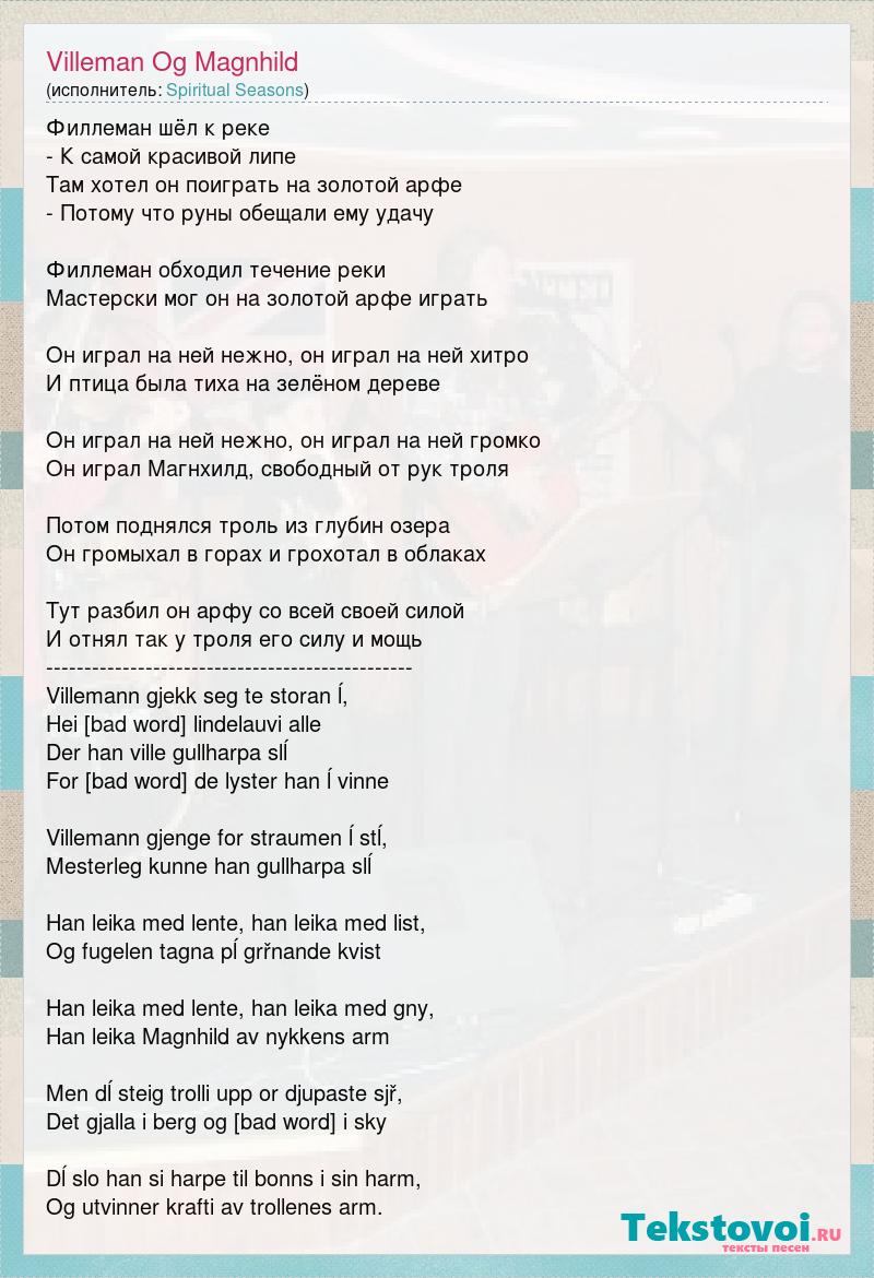 Филлеман шёл к реке - К самой красивой липе Там хотел он поиграть на золотой арфе - Потому что руны обещали ему удачу Филлеман обходил течение реки Мастерски мог он на золотой арфе играть Он играл на ней нежно, он играл на ней хитро И птица была тиха на зелёном дереве Он играл на ней нежно, он играл на ней громко Он играл Магнхилд, свободный от рук троля Потом поднялся троль из глубин озера Он громыхал в горах и грохотал в облаках Тут разбил он арфу со всей своей силой И отнял так у троля его силу и мощь ------------------------------------------------ Villemann gjekk seg te storan ĺ, Hei [bad word] lindelauvi alle Der han ville gullharpa slĺ For de runerne de lyster han ĺ vinne Villemann gjenge for straumen ĺ stĺ, Mesterleg kunne han gullharpa slĺ Han leika med lente, han leika med list, Og fugelen tagna pĺ grřnande kvist Han leika med lente, han leika med gny, Han leika Magnhild av nykkens arm Men dĺ steig trolli upp or djupaste sjř, Det gjalla i berg og det runga i sky Dĺ slo han si harpe til bonns i sin harm, Og utvinner krafti av trollenes arm.