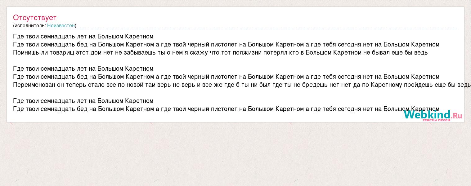 Где твои семнадцать лет на Большом Каретном Где твои семнадцать бед на Большом Каретном а где твой черный пистолет на Большом Каретном а где тебя сегодня нет на Большом Каретном Помнишь ли товарищ этот дом нет не забываешь ты о нем я скажу что тот полжизни потерял кто в Большом Каретном не бывал еще бы ведь Где твои семнадцать лет на Большом Каретном Где твои семнадцать бед на Большом Каретном а где твой черный пистолет на Большом Каретном а где тебя сегодня нет на Большом Каретном Переименован он теперь стало все по новой там верь не верь и все же где б ты ни был где ты не бредешь нет нет да по Каретному пройдешь еще бы ведь Где твои семнадцать лет на Большом Каретном Где твои семнадцать бед на Большом Каретном а где твой черный пистолет на Большом Каретном а где тебя сегодня нет на Большом Каретном