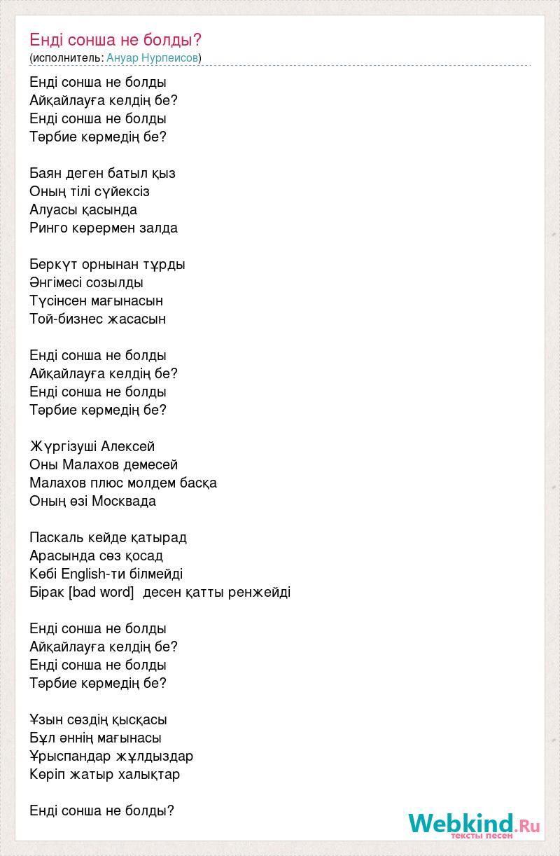 Енді сонша не болды Айқайлауға келдің бе? Енді сонша не болды Тәрбие көрмедің бе? Баян деген батыл қыз Оның тілі сүйексіз Алуасы қасында Ринго көрермен залда Беркүт орнынан тұрды Әнгімесі созылды Түсінсен мағынасын Той-бизнес жасасын Енді сонша не болды Айқайлауға келдің бе? Енді сонша не болды Тәрбие көрмедің бе? Жүргізуші Алексей Оны Малахов демесей Малахов плюс молдем басқа Оның өзі Москвада Паскаль кейде қатырад Арасында сөз қосад Көбі English-ти білмейдi Бiрак [bad word] десен қатты ренжейдi Енді сонша не болды Айқайлауға келдің бе? Енді сонша не болды Тәрбие көрмедің бе? Ұзын сөздің қысқасы Бұл әннің мағынасы Ұрыспандар жұлдыздар Көріп жатыр халықтар Енді сонша не болды?