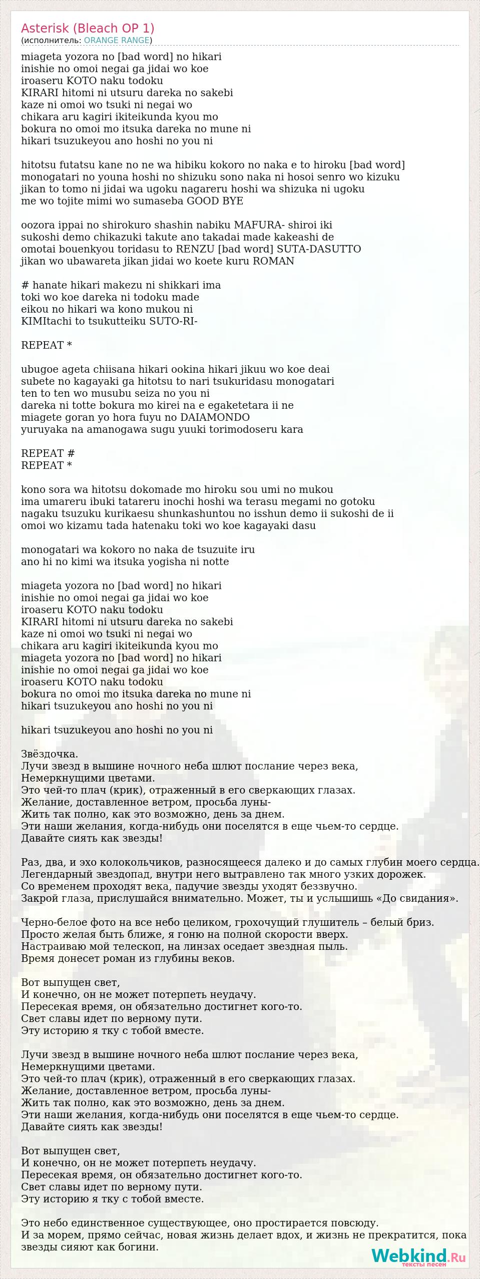 miageta yozora no [bad word] no hikari inishie no omoi negai ga jidai wo koe iroaseru KOTO naku todoku KIRARI hitomi ni utsuru dareka no sakebi kaze ni omoi wo tsuki ni negai wo chikara aru kagiri ikiteikunda kyou mo bokura no omoi mo itsuka dareka no mune ni hikari tsuzukeyou ano hoshi no you ni hitotsu futatsu kane no ne wa hibiku kokoro no naka e to hiroku [bad word] monogatari no youna hoshi no shizuku sono naka ni hosoi senro wo kizuku jikan to tomo ni jidai wa ugoku nagareru hoshi wa shizuka ni ugoku me wo tojite mimi wo sumaseba GOOD BYE oozora ippai no shirokuro shashin nabiku MAFURA- shiroi iki sukoshi demo chikazuki takute ano takadai made kakeashi de omotai bouenkyou toridasu to RENZU [bad word] SUTA-DASUTTO jikan wo ubawareta jikan jidai wo koete kuru ROMAN # hanate hikari makezu ni shikkari ima toki wo koe dareka ni todoku made eikou no hikari wa kono mukou ni KIMItachi to tsukutteiku SUTO-RI- REPEAT * ubugoe ageta chiisana hikari ookina hikari jikuu wo koe deai subete no kagayaki ga hitotsu to nari tsukuridasu monogatari ten to ten wo musubu seiza no you ni dareka ni totte bokura mo kirei na e egaketetara ii ne miagete goran yo hora fuyu no DAIAMONDO yuruyaka na amanogawa sugu yuuki torimodoseru kara REPEAT # REPEAT * kono sora wa hitotsu dokomade mo hiroku sou umi no mukou ima umareru ibuki tatareru inochi hoshi wa terasu megami no gotoku nagaku tsuzuku kurikaesu shunkashuntou no isshun demo ii sukoshi de ii omoi wo kizamu tada hatenaku toki wo koe kagayaki dasu monogatari wa kokoro no naka de tsuzuite iru ano hi no kimi wa itsuka yogisha ni notte miageta yozora no [bad word] no hikari inishie no omoi negai ga jidai wo koe iroaseru KOTO naku todoku KIRARI hitomi ni utsuru dareka no sakebi kaze ni omoi wo tsuki ni negai wo chikara aru kagiri ikiteikunda kyou mo miageta yozora no [bad word] no hikari inishie no omoi negai ga jidai wo koe iroaseru KOTO naku todoku bokura no omoi mo itsuka dareka no mune ni hikari tsuzukeyou ano hoshi no you ni hikari tsuzukeyou ano hoshi no you ni Звёздочка. Лучи звезд в вышине ночного неба шлют послание через века, Немеркнущими цветами. Это чей-то плач (крик), отраженный в его сверкающих глазах. Желание, доставленное ветром, просьба луны- Жить так полно, как это возможно, день за днем. Эти наши желания, когда-нибудь они поселятся в еще чьем-то сердце. Давайте сиять как звезды! Раз, два, и эхо колокольчиков, разносящееся далеко и до самых глубин моего сердца. Легендарный звездопад, внутри него вытравлено так много узких дорожек. Со временем проходят века, падучие звезды уходят беззвучно. Закрой глаза, прислушайся внимательно. Может, ты и услышишь «До свидания». Черно-белое фото на все небо целиком, грохочущий глушитель – белый бриз. Просто желая быть ближе, я гоню на полной скорости вверх. Настраиваю мой телескоп, на линзах оседает звездная пыль. Время донесет роман из глубины веков. Вот выпущен свет, И конечно, он не может потерпеть неудачу. Пересекая время, он обязательно достигнет кого-то. Свет славы идет по верному пути. Эту историю я тку с тобой вместе. Лучи звезд в вышине ночного неба шлют послание через века, Немеркнущими цветами. Это чей-то плач (крик), отраженный в его сверкающих глазах. Желание, доставленное ветром, просьба луны- Жить так полно, как это возможно, день за днем. Эти наши желания, когда-нибудь они поселятся в еще чьем-то сердце. Давайте сиять как звезды! Вот выпущен свет, И конечно, он не может потерпеть неудачу. Пересекая время, он обязательно достигнет кого-то. Свет славы идет по верному пути. Эту историю я тку с тобой вместе. Это небо единственное существующее, оно простирается повсюду. И за морем, прямо сейчас, новая жизнь делает вдох, и жизнь не прекратится, пока звезды сияют как богини.
