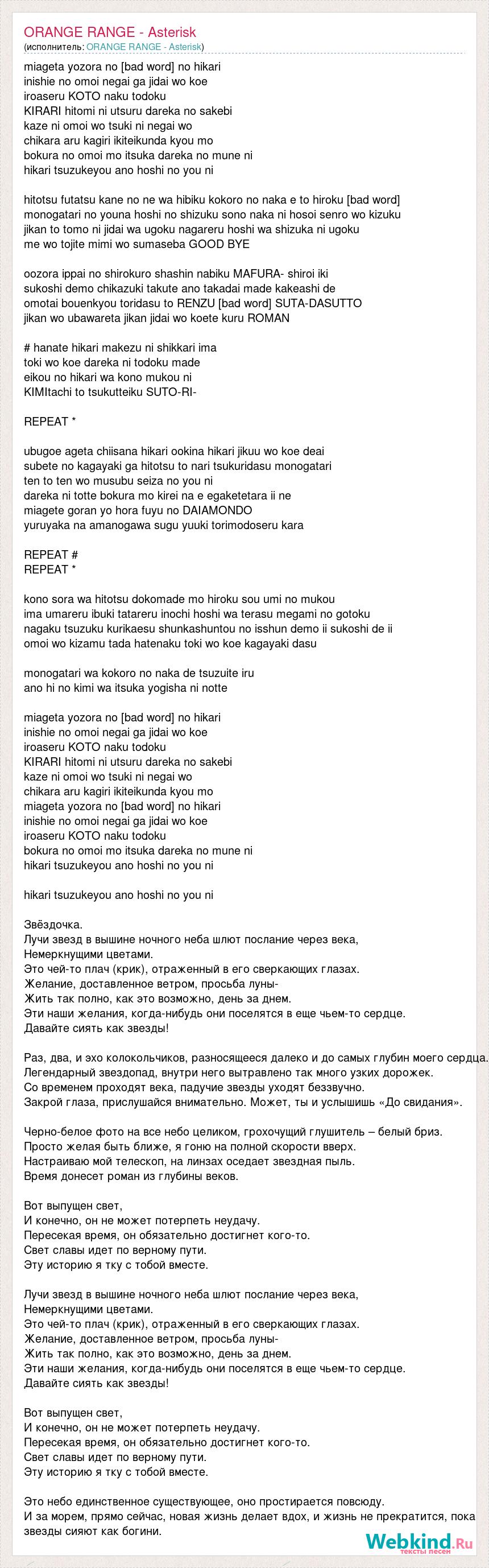 miageta yozora no [bad word] no hikari inishie no omoi negai ga jidai wo koe iroaseru KOTO naku todoku KIRARI hitomi ni utsuru dareka no sakebi kaze ni omoi wo tsuki ni negai wo chikara aru kagiri ikiteikunda kyou mo bokura no omoi mo itsuka dareka no mune ni hikari tsuzukeyou ano hoshi no you ni hitotsu futatsu kane no ne wa hibiku kokoro no naka e to hiroku [bad word] monogatari no youna hoshi no shizuku sono naka ni hosoi senro wo kizuku jikan to tomo ni jidai wa ugoku nagareru hoshi wa shizuka ni ugoku me wo tojite mimi wo sumaseba GOOD BYE oozora ippai no shirokuro shashin nabiku MAFURA- shiroi iki sukoshi demo chikazuki takute ano takadai made kakeashi de omotai bouenkyou toridasu to RENZU [bad word] SUTA-DASUTTO jikan wo ubawareta jikan jidai wo koete kuru ROMAN # hanate hikari makezu ni shikkari ima toki wo koe dareka ni todoku made eikou no hikari wa kono mukou ni KIMItachi to tsukutteiku SUTO-RI- REPEAT * ubugoe ageta chiisana hikari ookina hikari jikuu wo koe deai subete no kagayaki ga hitotsu to nari tsukuridasu monogatari ten to ten wo musubu seiza no you ni dareka ni totte bokura mo kirei na e egaketetara ii ne miagete goran yo hora fuyu no DAIAMONDO yuruyaka na amanogawa sugu yuuki torimodoseru kara REPEAT # REPEAT * kono sora wa hitotsu dokomade mo hiroku sou umi no mukou ima umareru ibuki tatareru inochi hoshi wa terasu megami no gotoku nagaku tsuzuku kurikaesu shunkashuntou no isshun demo ii sukoshi de ii omoi wo kizamu tada hatenaku toki wo koe kagayaki dasu monogatari wa kokoro no naka de tsuzuite iru ano hi no kimi wa itsuka yogisha ni notte miageta yozora no [bad word] no hikari inishie no omoi negai ga jidai wo koe iroaseru KOTO naku todoku KIRARI hitomi ni utsuru dareka no sakebi kaze ni omoi wo tsuki ni negai wo chikara aru kagiri ikiteikunda kyou mo miageta yozora no [bad word] no hikari inishie no omoi negai ga jidai wo koe iroaseru KOTO naku todoku bokura no omoi mo itsuka dareka no mune ni hikari tsuzukeyou ano hoshi no you ni hikari tsuzukeyou ano hoshi no you ni Звёздочка. Лучи звезд в вышине ночного неба шлют послание через века, Немеркнущими цветами. Это чей-то плач (крик), отраженный в его сверкающих глазах. Желание, доставленное ветром, просьба луны- Жить так полно, как это возможно, день за днем. Эти наши желания, когда-нибудь они поселятся в еще чьем-то сердце. Давайте сиять как звезды! Раз, два, и эхо колокольчиков, разносящееся далеко и до самых глубин моего сердца. Легендарный звездопад, внутри него вытравлено так много узких дорожек. Со временем проходят века, падучие звезды уходят беззвучно. Закрой глаза, прислушайся внимательно. Может, ты и услышишь «До свидания». Черно-белое фото на все небо целиком, грохочущий глушитель – белый бриз. Просто желая быть ближе, я гоню на полной скорости вверх. Настраиваю мой телескоп, на линзах оседает звездная пыль. Время донесет роман из глубины веков. Вот выпущен свет, И конечно, он не может потерпеть неудачу. Пересекая время, он обязательно достигнет кого-то. Свет славы идет по верному пути. Эту историю я тку с тобой вместе. Лучи звезд в вышине ночного неба шлют послание через века, Немеркнущими цветами. Это чей-то плач (крик), отраженный в его сверкающих глазах. Желание, доставленное ветром, просьба луны- Жить так полно, как это возможно, день за днем. Эти наши желания, когда-нибудь они поселятся в еще чьем-то сердце. Давайте сиять как звезды! Вот выпущен свет, И конечно, он не может потерпеть неудачу. Пересекая время, он обязательно достигнет кого-то. Свет славы идет по верному пути. Эту историю я тку с тобой вместе. Это небо единственное существующее, оно простирается повсюду. И за морем, прямо сейчас, новая жизнь делает вдох, и жизнь не прекратится, пока звезды сияют как богини.