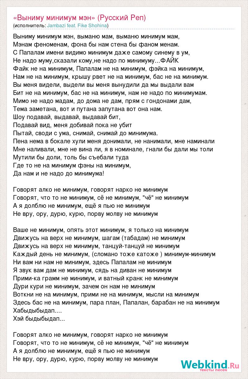 Выниму минимум мэн, выманю мам, выманю минимум мам, Мэнам феноменам, фона бы нам стена бы фаном менам. С Папалам имени видимо минимум даже самому синему в ум, Не надо муму,сказали кому,не надо по минимуму...ФАЙК Файк не на минимум, Папалам не на минимум, фэйка на минимум, Нам не на минимум, крышу рвет не на минимум, бас не на минимум. Вы меня видели, выдели вы меня вынудили да мы выдали вам Бит не на минимум, бас не на минимум, нам не надо по минимумам. Мимо не надо мадам, до дома не дам, прям с гондонами дам, Тема заметана, вот и путана запутана вот она нам. Шоу подавай, выдавай, выдавай бит, Подавай вид, меня добивай пока не убит Пытай, своди с ума, снимай, снимай до минимума. Пена нема в бокале хули меня донимали, не нанимали, мне наминали Мне наливали, мне не вина ли, я в номинале, гнали бы дали мы толи Мутили бы доли, толь бы съебали туда Где то не на минимум фэны на минимум, Да нам и не надо до минимума! Говорят алко не минимум, говорят нарко не минимум Говорят, что то не минимум, сё не минимум, "чё" не минимум А я долблю не минимум, ещё я пью не минимум Не вру, ору, дурю, курю, порву молву не минимум Ваше не минимум, опять этот минимум, я только на минимум Движусь на верх не минимум, шагам (табадам) не минимум Движусь на верх не минимум, танцуй-танцуй не минимум Каждый день не минимум, (сломано тоже катоже ) минимум-минимум Ни вам ни нам не минимум, здесь Папалам не минимум Я звук вам дам не минимум, сядь на диван не минимум Прими-ка грамм не минимум, и ватный кранк не минимум Дури кури не минимум, зачем он нам не минимум Воткни не на минимум, прими не на минимум, мысли на минимум Здесь бас не на минимум, пара план, Папалан, барабан не на минимум Хабыдыбыдап.... Хэй быдыбыдап... Говорят алко не минимум, говорят нарко не минимум Говорят, что то не минимум, сё не минимум, "чё" не минимум А я долблю не минимум, ещё я пью не минимум Не вру, ору, дурю, курю, порву молву не минимум