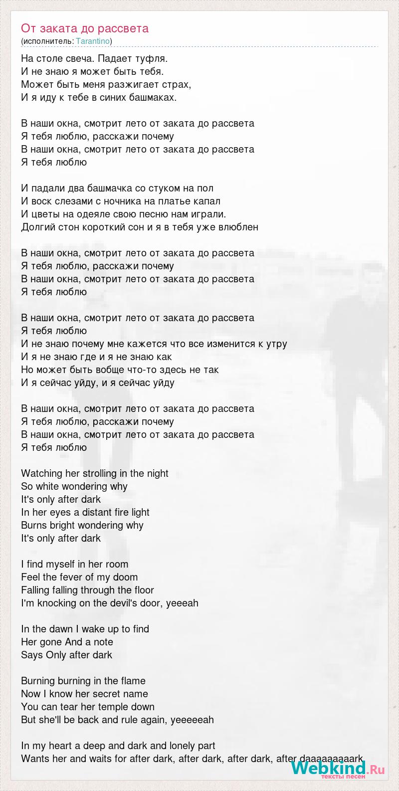 На столе свеча. Падает туфля. И не знаю я может быть тебя. Может быть меня разжигает страх, И я иду к тебе в синих башмаках. В наши окна, смотрит лето от заката до рассвета Я тебя люблю, расскажи почему В наши окна, смотрит лето от заката до рассвета Я тебя люблю И падали два башмачка со стуком на пол И воск слезами с ночника на платье капал И цветы на одеяле свою песню нам играли. Долгий стон короткий сон и я в тебя уже влюблен В наши окна, смотрит лето от заката до рассвета Я тебя люблю, расскажи почему В наши окна, смотрит лето от заката до рассвета Я тебя люблю В наши окна, смотрит лето от заката до рассвета Я тебя люблю И не знаю почему мне кажется что все изменится к утру И я не знаю где и я не знаю как Но может быть вобще что-то здесь не так И я сейчас уйду, и я сейчас уйду В наши окна, смотрит лето от заката до рассвета Я тебя люблю, расскажи почему В наши окна, смотрит лето от заката до рассвета Я тебя люблю Watching her strolling in the night So white wondering why It's only after dark In her eyes a distant fire light Burns bright wondering why It's only after dark I find myself in her room Feel the fever of my doom Falling falling through the floor I'm knocking on the devil's door, yeeeah In the dawn I wake up to find Her gone And a note Says Only after dark Burning burning in the flame Now I know her secret name You can tear her temple down But she'll be back and rule again, yeeeeeah In my heart a deep and dark and lonely part Wants her and waits for after dark, after dark, after dark, after daaaaaaaaark