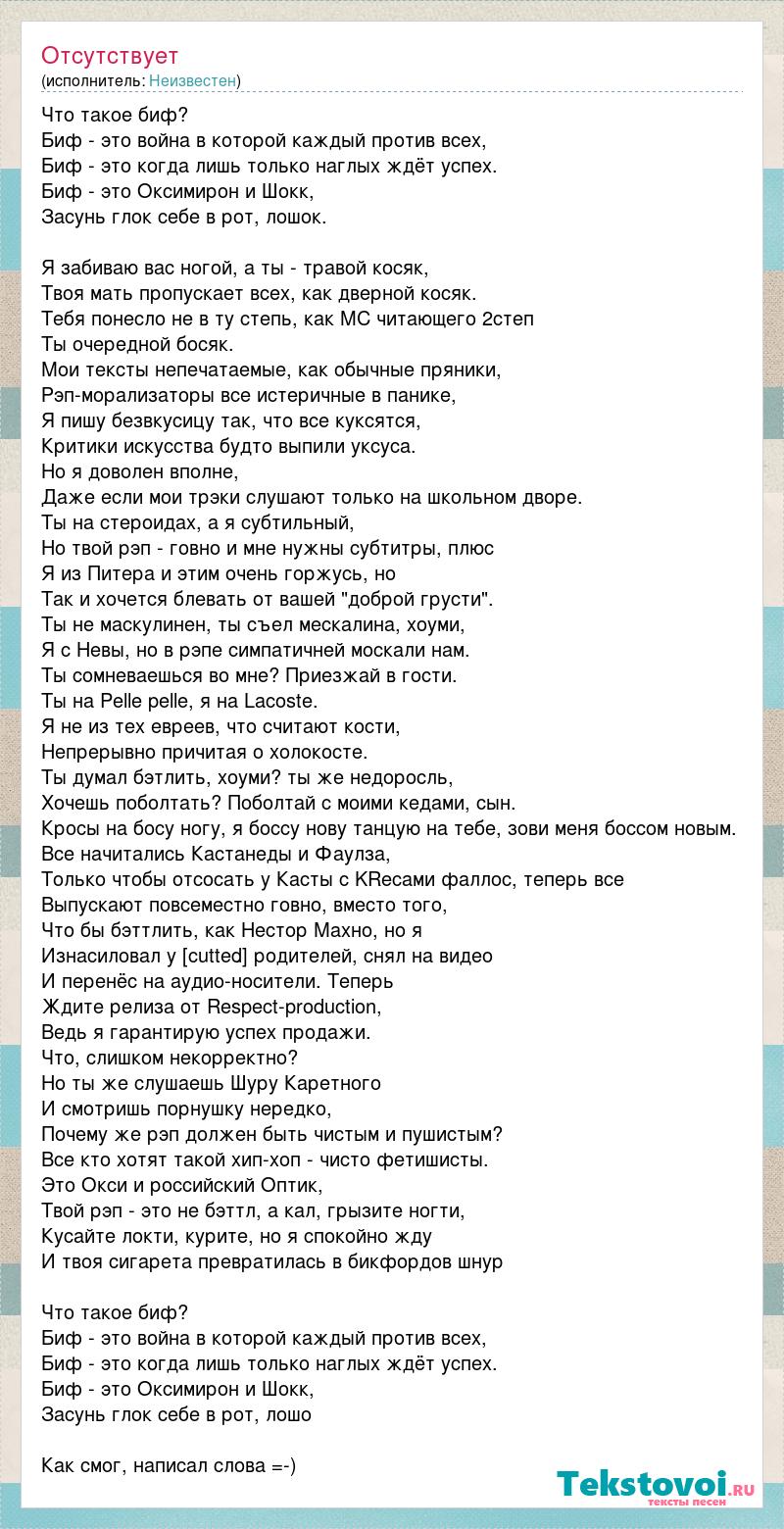 Что такое биф? Биф - это война в которой каждый против всех, Биф - это когда лишь только наглых ждёт успех. Биф - это Оксимирон и Шокк, Засунь глок себе в рот, лошок. Я забиваю вас ногой, а ты - травой косяк, Твоя мать пропускает всех, как дверной косяк. Тебя понесло не в ту степь, как MC читающего 2степ Ты очередной босяк. Мои тексты непечатаемые, как обычные пряники, Рэп-морализаторы все истеричные в панике, Я пишу безвкусицу так, что все куксятся, Критики искусства будто выпили уксуса. Но я доволен вполне, Даже если мои трэки слушают только на школьном дворе. Ты на стероидах, а я субтильный, Но твой рэп - говно и мне нужны субтитры, плюс Я из Питера и этим очень горжусь, но Так и хочется блевать от вашей "доброй грусти". Ты не маскулинен, ты съел мескалина, хоуми, Я с Невы, но в рэпе симпатичней москали нам. Ты сомневаешься во мне? Приезжай в гости. Ты на Pelle pelle, я на Lacoste. Я не из тех евреев, что считают кости, Непрерывно причитая о холокосте. Ты думал бэтлить, хоуми? ты же недоросль, Хочешь поболтать? Поболтай с моими кедами, сын. Кросы на босу ногу, я боссу нову танцую на тебе, зови меня боссом новым. Все начитались Кастанеды и Фаулза, Только чтобы отсосать у Касты с KRecами фаллос, теперь все Выпускают повсеместно говно, вместо того, Что бы бэттлить, как Нестор Махно, но я Изнасиловал у [cutted] родителей, снял на видео И перенёс на аудио-носители. Теперь Ждите релиза от Respect-production, Ведь я гарантирую успех продажи. Что, слишком некорректно? Но ты же слушаешь Шуру Каретного И смотришь порнушку нередко, Почему же рэп должен быть чистым и пушистым? Все кто хотят такой хип-хоп - чисто фетишисты. Это Окси и российский Оптик, Твой рэп - это не бэттл, а кал, грызите ногти, Кусайте локти, курите, но я спокойно жду И твоя сигарета превратилась в бикфордов шнур Что такое биф? Биф - это война в которой каждый против всех, Биф - это когда лишь только наглых ждёт успех. Биф - это Оксимирон и Шокк, Засунь глок себе в рот, лошо Как смог, написал слова =-)