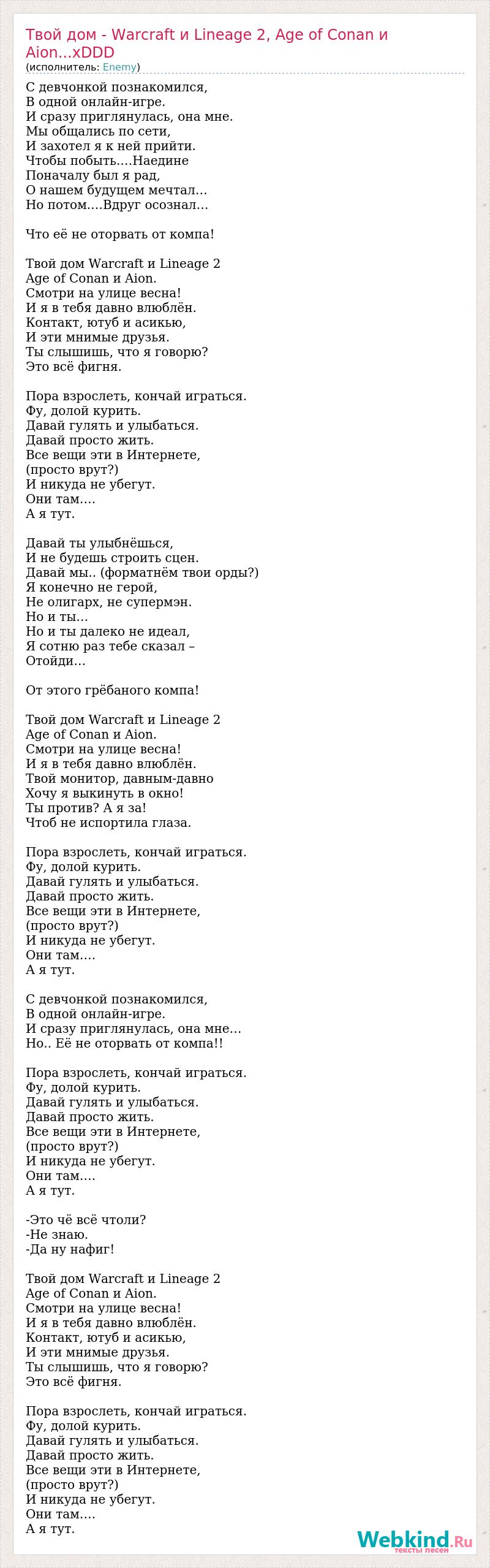 С девчонкой познакомился, В одной онлайн-игре. И сразу приглянулась, она мне. Мы общались по сети, И захотел я к ней прийти. Чтобы побыть.…Наедине Поначалу был я рад, О нашем будущем мечтал… Но потом.…Вдруг осознал… Что её не оторвать от компа! Твой дом Warcraft и Lineage 2 Age of Conan и Aion. Смотри на улице весна! И я в тебя давно влюблён. Контакт, ютуб и асикью, И эти мнимые друзья. Ты слышишь, что я говорю? Это всё фигня. Пора взрослеть, кончай играться. Фу, долой курить. Давай гулять и улыбаться. Давай просто жить. Все вещи эти в Интернете, (просто врут?) И никуда не убегут. Они там…. А я тут. Давай ты улыбнёшься, И не будешь строить сцен. Давай мы.. (форматнём твои орды?) Я конечно не герой, Не олигарх, не супермэн. Но и ты… Но и ты далеко не идеал, Я сотню раз тебе сказал – Отойди… От этого грёбаного компа! Твой дом Warcraft и Lineage 2 Age of Conan и Aion. Смотри на улице весна! И я в тебя давно влюблён. Твой монитор, давным-давно Хочу я выкинуть в окно! Ты против? А я за! Чтоб не испортила глаза. Пора взрослеть, кончай играться. Фу, долой курить. Давай гулять и улыбаться. Давай просто жить. Все вещи эти в Интернете, (просто врут?) И никуда не убегут. Они там…. А я тут. С девчонкой познакомился, В одной онлайн-игре. И сразу приглянулась, она мне… Но.. Её не оторвать от компа!! Пора взрослеть, кончай играться. Фу, долой курить. Давай гулять и улыбаться. Давай просто жить. Все вещи эти в Интернете, (просто врут?) И никуда не убегут. Они там…. А я тут. -Это чё всё чтоли? -Не знаю. -Да ну нафиг! Твой дом Warcraft и Lineage 2 Age of Conan и Aion. Смотри на улице весна! И я в тебя давно влюблён. Контакт, ютуб и асикью, И эти мнимые друзья. Ты слышишь, что я говорю? Это всё фигня. Пора взрослеть, кончай играться. Фу, долой курить. Давай гулять и улыбаться. Давай просто жить. Все вещи эти в Интернете, (просто врут?) И никуда не убегут. Они там…. А я тут.
