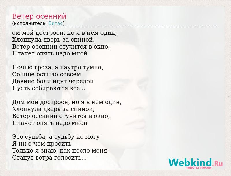 ом мой достроен, но я в нем один, Хлопнула дверь за спиной, Ветер осенний стучится в окно, Плачет опять надо мной Ночью гроза, а наутро тумно, Солнце остыло совсем Давние боли идут чередой Пусть собираются все... Дом мой достроен, но я в нем один, Хлопнула дверь за спиной, Ветер осенний стучится в окно, Плачет опять надо мной Это судьба, а судьбу не могу Я ни о чем просить Только я знаю, как после меня Станут ветра голосить...