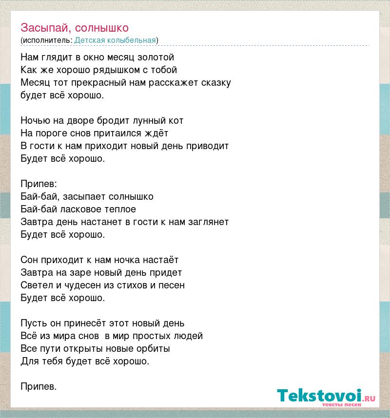 Нам глядит в окно месяц золотой Как же хорошо рядышком с тобой Месяц тот прекрасный нам расскажет сказку будет всё хорошо. Ночью на дворе бродит лунный кот На пороге снов притаился ждёт В гости к нам приходит новый день приводит Будет всё хорошо. Припев: Бай-бай, засыпает солнышко Бай-бай ласковое теплое Завтра день настанет в гости к нам заглянет Будет всё хорошо. Сон приходит к нам ночка настаёт Завтра на заре новый день придет Светел и чудесен из стихов и песен Будет всё хорошо. Пусть он принесёт этот новый день Всё из мира снов в мир простых людей Все пути открыты новые орбиты Для тебя будет всё хорошо. Припев.
