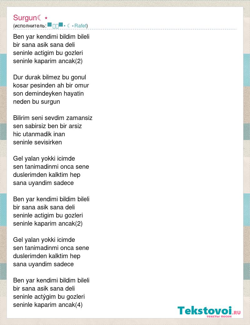 Ben yar kendimi bildim bileli bir sana asik sana deli seninle actigim bu gozleri seninle kaparim ancak(2) Dur durak bilmez bu gonul kosar pesinden ah bir omur son demindeyken hayatin neden bu surgun Bilirim seni sevdim zamansiz sen sabirsiz ben bir arsiz hic utanmadik inan seninle sevisirken Gel yalan yokki icimde sen tanimadinmi onca sene duslerimden kalktim hep sana uyandim sadece Ben yar kendimi bildim bileli bir sana asik sana deli seninle actigim bu gozleri seninle kaparim ancak(2) Gel yalan yokki icimde sen tanimadinmi onca sene duslerimden kalktim hep sana uyandim sadece Ben yar kendimi bildim bileli bir sana asik sana deli seninle actýgim bu gozleri seninle kaparim ancak(4)