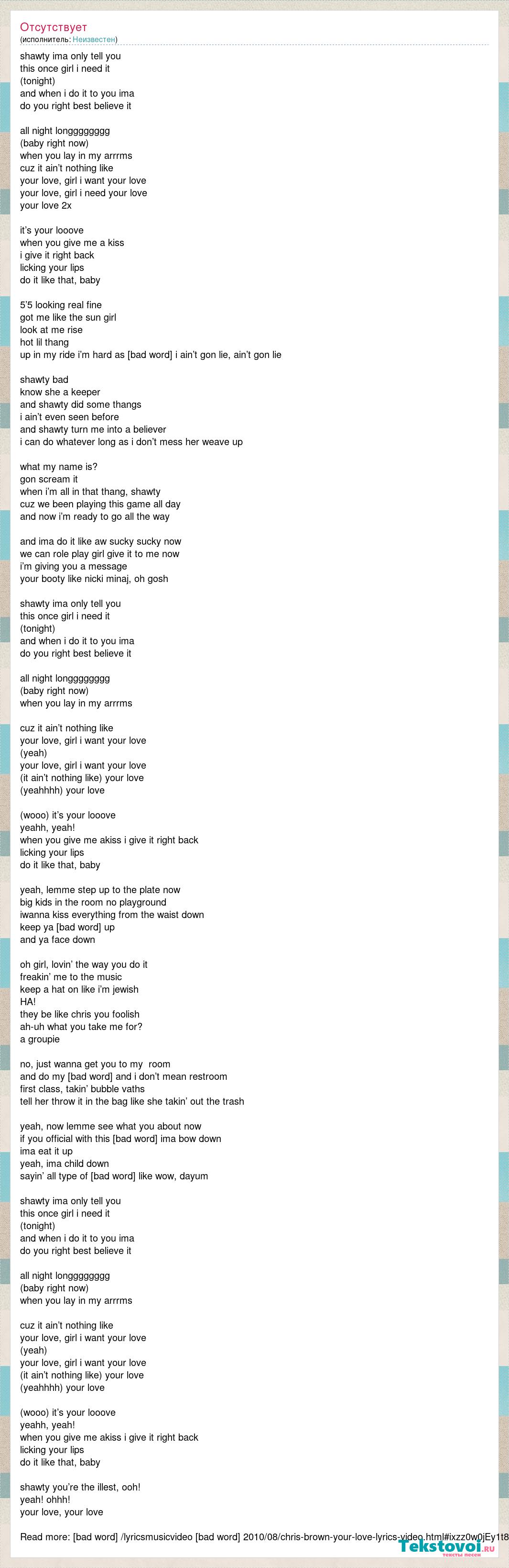 shawty ima only tell you this once girl i need it (tonight) and when i do it to you ima do you right best believe it all night longggggggg (baby right now) when you lay in my arrrms cuz it ain’t nothing like your love, girl i want your love your love, girl i need your love your love 2x it’s your looove when you give me a kiss i give it right back licking your lips do it like that, baby 5’5 looking real fine got me like the sun girl look at me rise hot lil thang up in my ride i’m hard as hell i ain’t gon lie, ain’t gon lie shawty bad know she a keeper and shawty did some thangs i ain’t even seen before and shawty turn me into a believer i can do whatever long as i don’t mess her weave up what my name is? gon scream it when i’m all in that thang, shawty cuz we been playing this game all day and now i’m ready to go all the way and ima do it like aw sucky sucky now we can role play girl give it to me now i’m giving you a message your booty like nicki minaj, oh gosh shawty ima only tell you this once girl i need it (tonight) and when i do it to you ima do you right best believe it all night longggggggg (baby right now) when you lay in my arrrms cuz it ain’t nothing like your love, girl i want your love (yeah) your love, girl i want your love (it ain’t nothing like) your love (yeahhhh) your love (wooo) it’s your looove yeahh, yeah! when you give me akiss i give it right back licking your lips do it like that, baby yeah, lemme step up to the plate now big kids in the room no playground iwanna kiss everything from the waist down keep ya [bad word] up and ya face down oh girl, lovin’ the way you do it freakin’ me to the music keep a hat on like i’m jewish HA! they be like chris you foolish ah-uh what you take me for? a groupie no, just wanna get you to my room and do my [bad word] and i don’t mean restroom first class, takin’ bubble vaths tell her throw it in the bag like she takin’ out the trash yeah, now lemme see what you about now if you official with this [bad word] ima bow down ima eat it up yeah, ima child down sayin’ all type of [bad word] like wow, dayum shawty ima only tell you this once girl i need it (tonight) and when i do it to you ima do you right best believe it all night longggggggg (baby right now) when you lay in my arrrms cuz it ain’t nothing like your love, girl i want your love (yeah) your love, girl i want your love (it ain’t nothing like) your love (yeahhhh) your love (wooo) it’s your looove yeahh, yeah! when you give me akiss i give it right back licking your lips do it like that, baby shawty you’re the illest, ooh! yeah! ohhh! your love, your love Read more: [bad word] /lyricsmusicvideo [bad word] 2010/08/chris-brown-your-love-lyrics-video.html#ixzz0w0jEy1t8