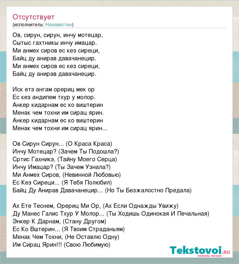 Ов, сирун, сирун, инчу мотецар, Сытыс гахтникы инчу имацар. Ми анмех сиров ес кез сиреци, Байц ду анирав давачанецир. Ми анмех сиров ес кез сиреци, Байц ду анирав давачанецир. Иск етэ ангам орериц мек ор Ес кез андипем тхур у молор. Анкер кидарнам ес ко виштерин Менак чем тохни им сирац ярин. Анкер кидарнам ес ко виштерин Менак чем тохни им сирац ярин... Ов Сирун Сирун... (О Краса Краса) Инчу Мотецар? (Зачем Ты Подошла?) Сртис Гахникэ, (Тайну Моего Серца) Инчу Имацар? (Ты Зачем Узнала?) Ми Анмех Сиров, (Невинной Любовью) Ес Кез Сиреци... (Я Тебя Полюбил) Байц Ду Анирав Давачанецир... (Но Ты Безжалостно Предала) Ах Ете Теснем, Орериц Ми Ор, (Ах Если Однажды Увижу) Ду Манес Галис Тхур У Молор... (Ты Ходишь Одинокая И Печальная) Энкер К Дарнам, (Стану Другом) Ес Ко Вштерин... (Я Твоим Страданьям) Менак Чем Тохни, (Не Оставлю Одну) Им Сирац Ярин!!! (Свою Любимую)