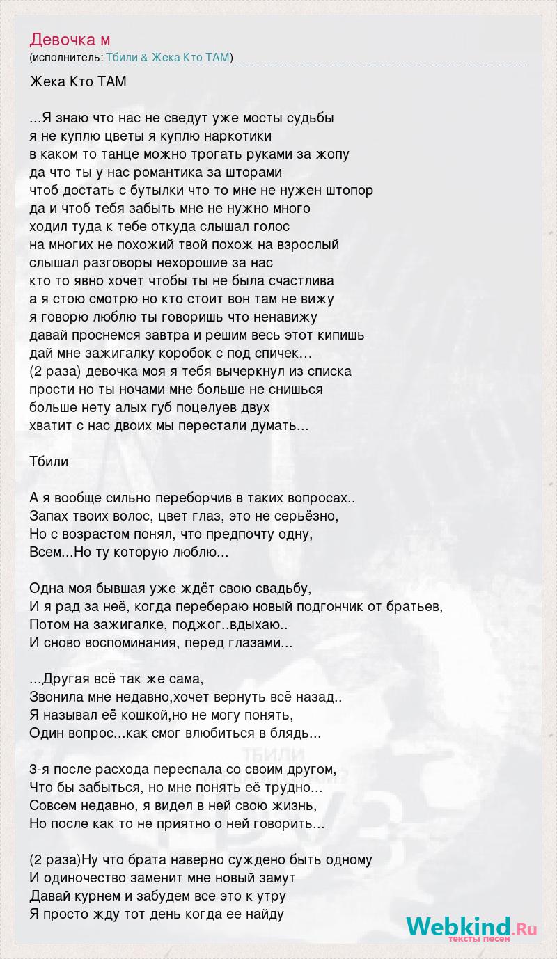 Жека Кто ТАМ ...Я знаю что нас не сведут уже мосты судьбы я не куплю цветы я куплю наркотики в каком то танце можно трогать руками за жопу да что ты у нас романтика за шторами чтоб достать с бутылки что то мне не нужен штопор да и чтоб тебя забыть мне не нужно много ходил туда к тебе откуда слышал голос на многих не похожий твой похож на взрослый слышал разговоры нехорошие за нас кто то явно хочет чтобы ты не была счастлива а я стою смотрю но кто стоит вон там не вижу я говорю люблю ты говоришь что ненавижу давай проснемся завтра и решим весь этот кипишь дай мне зажигалку коробок с под спичек… (2 раза) девочка моя я тебя вычеркнул из списка прости но ты ночами мне больше не снишься больше нету алых губ поцелуев двух хватит с нас двоих мы перестали думать... Тбили А я вообще сильно переборчив в таких вопросах.. Запах твоих волос, цвет глаз, это не серьёзно, Но с возрастом понял, что предпочту одну, Всем...Но ту которую люблю... Одна моя бывшая уже ждёт свою свадьбу, И я рад за неё, когда перебераю новый подгончик от братьев, Потом на зажигалке, поджог..вдыхаю.. И сново воспоминания, перед глазами... ...Другая всё так же сама, Звонила мне недавно,хочет вернуть всё назад.. Я называл её кошкой,но не могу понять, Один вопрос...как смог влюбиться в блядь... 3-я после расхода переспала со своим другом, Что бы забыться, но мне понять её трудно... Совсем недавно, я видел в ней свою жизнь, Но после как то не приятно о ней говорить... (2 раза)Ну что брата наверно суждено быть одному И одиночество заменит мне новый замут Давай курнем и забудем все это к утру Я просто жду тот день когда ее найду