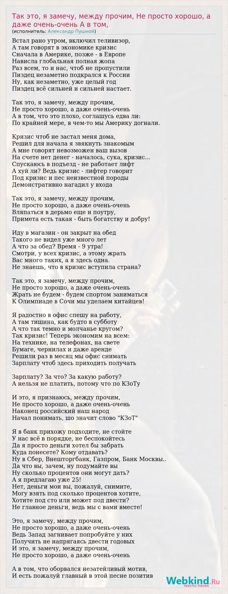 Встал рано утром, включил теливизор, А там говорят в экономике кризис Сначала в Америке, позже - в Европе Нависла глобальная полная жопа Раз всем, то и нас, чтоб не пропустили Пиздец незаметно подкрался к России Ну, как незаметно, уже целый год Пиздец всё сильней и сильней настает. Так это, я замечу, между прочим, Не просто хорошо, а даже очень-очень А в том, что это плохо, соглашусь едва ли: По крайней мере, в чем-то мы Америку догнали. Кризис чтоб не застал меня дома, Решил для начала я звякнуть знакомым А мне говорят невозможен ваш вызов На счете нет денег - началось, сука, кризис... Спускаюсь в подъезд - не работает лифт А хуй ли? Ведь кризис - лифтер говорит Под кризис и пес неизвестной породы Демонстративно нагадил у входа Так это, я замечу, между прочим, Не просто хорошо, а даже очень-очень Вляпаться в дерьмо еще и поутру, Примета есть такая - быть богатству и добру! Иду в магазин - он закрыт на обед Такого не видел уже много лет А что за обед? Время - 9 утра! Смотри, у всех кризис, а этому жрать Вас много таких, а я здесь одна. Не знаешь, что в кризис вступила страна? Так это, я замечу, между прочим, Не просто хорошо, а даже очень-очень Жрать не будем - будем спортом заниматься К Олимпиаде в Сочи мы уделаем китайцев! Я радостно в офис спешу на работу, А там тишина, как будто в субботу А что так темно и молчанье кругом? Так кризис! Теперь экономим на всем: На технике, на телефонах, на свете Бумаге, чернилах и даже аренде Решили раз в месяц мы офис снимать Зарплату чтоб здесь приходить получать Зарплату? За что? За какую работу? А нельзя не платить, потому что по КЗоТу И это, я признаюсь, между прочим, Не просто хорошо, а даже очень-очень Наконец российский наш народ Начал понимать, шо значит слово "КЗоТ" Я в банк прихожу подходите, не стойте У нас всё в порядке, не беспокойтесь Да я просто деньги хотел бы забрать Куда понесете? Кому отдавать? Ну в Сбер, Внешторгбанк, Газпром, Банк Москвы.. Да что вы, зачем, ну подумайте вы Ну сколько процентов они могут дать? А я предлагаю уже 25! Нет, деньги мои вы, пожалуй, снимите, Могу взять под сколько процентов хотите, Хотите под сто или может под двести? Не главное деньги, ведь мы с вами вместе! Это, я замечу, между прочим, Не просто хорошо, а даже очень-очень Ведь Запад загнивает попробуйте у них Получить не напрягаясь двести годовых И это, я замечу, между прочим, Не просто хорошо, а даже очень-очень А в том, что оборвался незатейливый мотив, И есть пожалуй главный в этой песне позитив