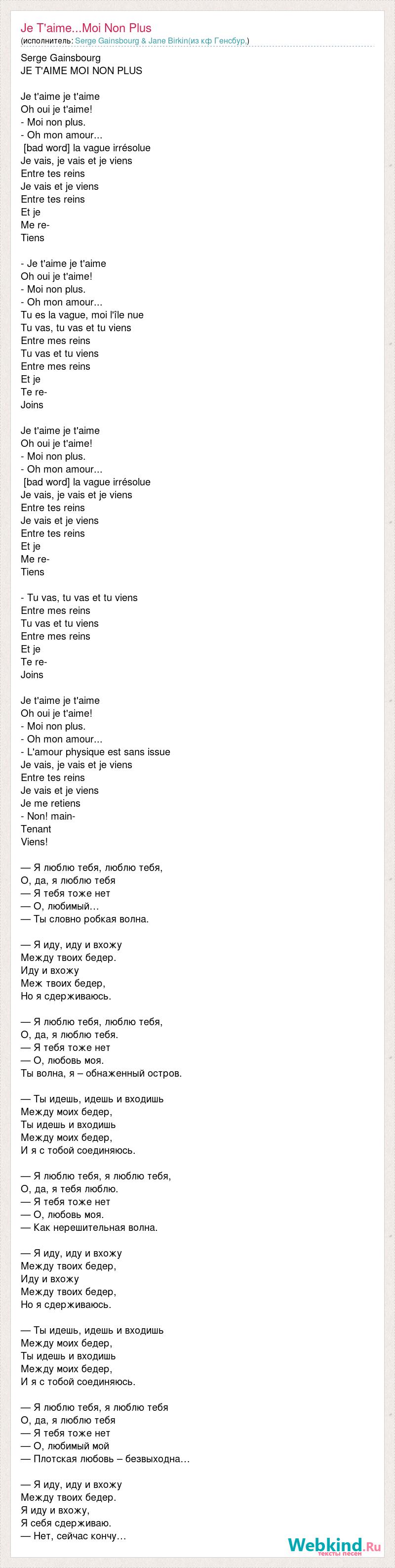 Serge Gainsbourg JE T'AIME MOI NON PLUS Je t'aime je t'aime Oh oui je t'aime! - Moi non plus. - Oh mon amour... [bad word] la vague irrésolue Je vais, je vais et je viens Entre tes reins Je vais et je viens Entre tes reins Et je Me re- Tiens - Je t'aime je t'aime Oh oui je t'aime! - Moi non plus. - Oh mon amour... Tu es la vague, moi l'île nue Tu vas, tu vas et tu viens Entre mes reins Tu vas et tu viens Entre mes reins Et je Te re- Joins Je t'aime je t'aime Oh oui je t'aime! - Moi non plus. - Oh mon amour... [bad word] la vague irrésolue Je vais, je vais et je viens Entre tes reins Je vais et je viens Entre tes reins Et je Me re- Tiens - Tu vas, tu vas et tu viens Entre mes reins Tu vas et tu viens Entre mes reins Et je Te re- Joins Je t'aime je t'aime Oh oui je t'aime! - Moi non plus. - Oh mon amour... - L'amour physique est sans issue Je vais, je vais et je viens Entre tes reins Je vais et je viens Je me retiens - Non! main- Tenant Viens! — Я люблю тебя, люблю тебя, О, да, я люблю тебя — Я тебя тоже нет — О, любимый… — Ты словно робкая волна. — Я иду, иду и вхожу Между твоих бедер. Иду и вхожу Меж твоих бедер, Но я сдерживаюсь. — Я люблю тебя, люблю тебя, О, да, я люблю тебя. — Я тебя тоже нет — О, любовь моя. Ты волна, я – обнаженный остров. — Ты идешь, идешь и входишь Между моих бедер, Ты идешь и входишь Между моих бедер, И я с тобой соединяюсь. — Я люблю тебя, я люблю тебя, О, да, я тебя люблю. — Я тебя тоже нет — О, любовь моя. — Как нерешительная волна. — Я иду, иду и вхожу Между твоих бедер, Иду и вхожу Между твоих бедер, Но я сдерживаюсь. — Ты идешь, идешь и входишь Между моих бедер, Ты идешь и входишь Между моих бедер, И я с тобой соединяюсь. — Я люблю тебя, я люблю тебя О, да, я люблю тебя — Я тебя тоже нет — О, любимый мой — Плотская любовь – безвыходна… — Я иду, иду и вхожу Между твоих бедер. Я иду и вхожу, Я себя сдерживаю. — Нет, сейчас кончу…
