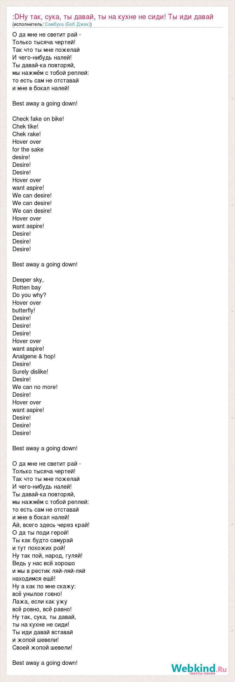 О да мне не светит рай - Только тысяча чертей! Так что ты мне пожелай И чего-нибудь налей! Ты давай-ка повторяй, мы нажмём с тобой реплей: то есть сам не отставай и мне в бокал налей! Best away a going down! Check fake on bike! Chek tike! Chek rake! Hover over for the sake desire! Desire! Desire! Hover over want aspire! We can desire! We can desire! We can desire! Hover over want aspire! Desire! Desire! Desire! Best away a going down! Deeper sky, Rotten bay Do you why? Hover over butterfly! Desire! Desire! Desire! Hover over want aspire! Analgene & hop! Desire! Surely dislike! Desire! We can no more! Desire! Hover over want aspire! Desire! Desire! Desire! Best away a going down! О да мне не светит рай - Только тысяча чертей! Так что ты мне пожелай И чего-нибудь налей! Ты давай-ка повторяй, мы нажмём с тобой реплей: то есть сам не отставай и мне в бокал налей! Ай, всего здесь через край! О да ты поди герой! Ты как будто самурай и тут похожих рой! Ну так пой, народ, гуляй! Ведь у нас всё хорошо и мы в рестик ляй-ляй-ляй находимся ещё! Ну а как по мне скажу: всё унылое говно! Лажа, если как ужу всё ровно, всё равно! Ну так, сука, ты давай, ты на кухне не сиди! Ты иди давай вставай и жопой шевели! Своей жопой шевели! Best away a going down!