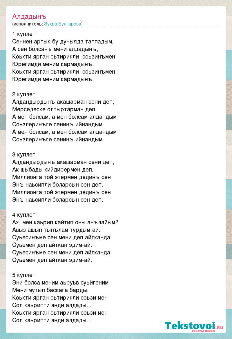 1 куплет Сеннен артык бу дуныяда таппадым, А сен болсанъ мени алдадынъ, Коькти ярган оьтирикли соьзинъмен Юрегимди меним кармадынъ. Коькти ярган оьтирикли соьзинъмен Юрегимди меним кармадынъ. 2 куплет Алдандырдынъ акашарман сени деп, Мерседеске олтыртарман деп. А мен болсам, а мен болсам алдандым Соьзлеринъге сенинъ ийнандым. А мен болсам, а мен болсам алдандым Соьзлеринъге сенинъ ийнандым. 3 куплет Алдандырдынъ акашарман сени деп, Ак шыбады кийдирермен деп. Миллионга той этермен дединъ сен Энъ наьсипли боларсын сен деп. Миллионга той этермен дединъ сен Энъ наьсипли боларсын сен деп. 4 куплет Ах, мен каьрип кайтип оны анълайым? Авыз ашып тынълам турдым-ай. Суьесинъме сен мени деп айтканда, Суьемен деп айткан эдим-ай. Суьесинъме сен мени деп айтканда, Суьемен деп айткан эдим-ай. 5 куплет Эни болса меним аьруьв суьйгеним Мени мутып баскага барды. Коькти ярган оьтирикли соьзи мен Сол каьрипти энди алдады... Коькти ярган оьтирикли соьзи мен Сол каьрипти энди алдады...