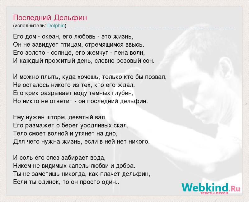 Его дом - океан, его любовь - это жизнь, Он не завидует птицам, стремящимся ввысь. Его золото - солнце, его жемчуг - пена волн, И каждый прожитый день, словно розовый сон. И можно плыть, куда хочешь, только кто бы позвал, Не осталось никого из тех, кто его ждал. Его крик разрывает воду темных глубин, Но никто не ответит - он последний дельфин. Ему нужен шторм, девятый вал Его размажет о берег уродливых скал. Тело смоет волной и утянет на дно, Для чего нужна жизнь, если в ней нет никого. И соль его слез забирает вода, Никем не видимых капель любви и добра. Ты не заметишь никогда, как плачет дельфин, Если ты одинок, то он просто один..
