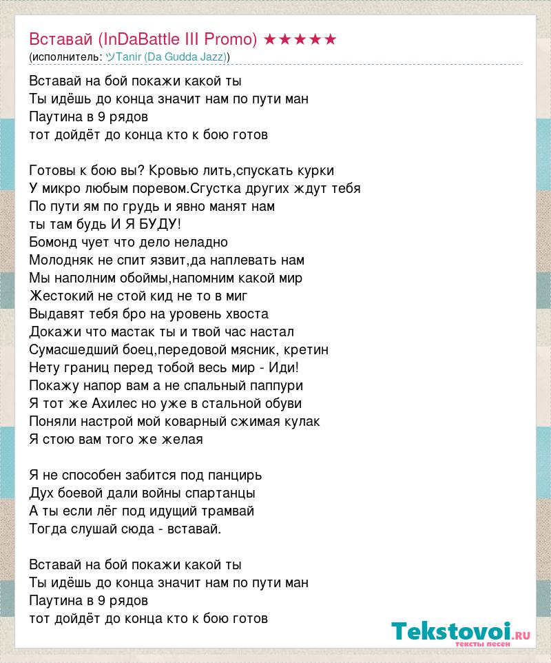 Вставай на бой покажи какой ты Ты идёшь до конца значит нам по пути ман Паутина в 9 рядов тот дойдёт до конца кто к бою готов Готовы к бою вы? Кровью лить,спускать курки У микро любым поревом.Сгустка других ждут тебя По пути ям по грудь и явно манят нам ты там будь И Я БУДУ! Бомонд чует что дело неладно Молодняк не спит язвит,да наплевать нам Мы наполним обоймы,напомним какой мир Жестокий не стой кид не то в миг Выдавят тебя бро на уровень хвоста Докажи что мастак ты и твой час настал Сумасшедший боец,передовой мясник, кретин Нету границ перед тобой весь мир - Иди! Покажу напор вам а не спальный паппури Я тот же Ахилес но уже в стальной обуви Поняли настрой мой коварный сжимая кулак Я стою вам того же желая Я не способен забится под панцирь Дух боевой дали войны спартанцы А ты если лёг под идущий трамвай Тогда слушай сюда - вставай. Вставай на бой покажи какой ты Ты идёшь до конца значит нам по пути ман Паутина в 9 рядов тот дойдёт до конца кто к бою готов