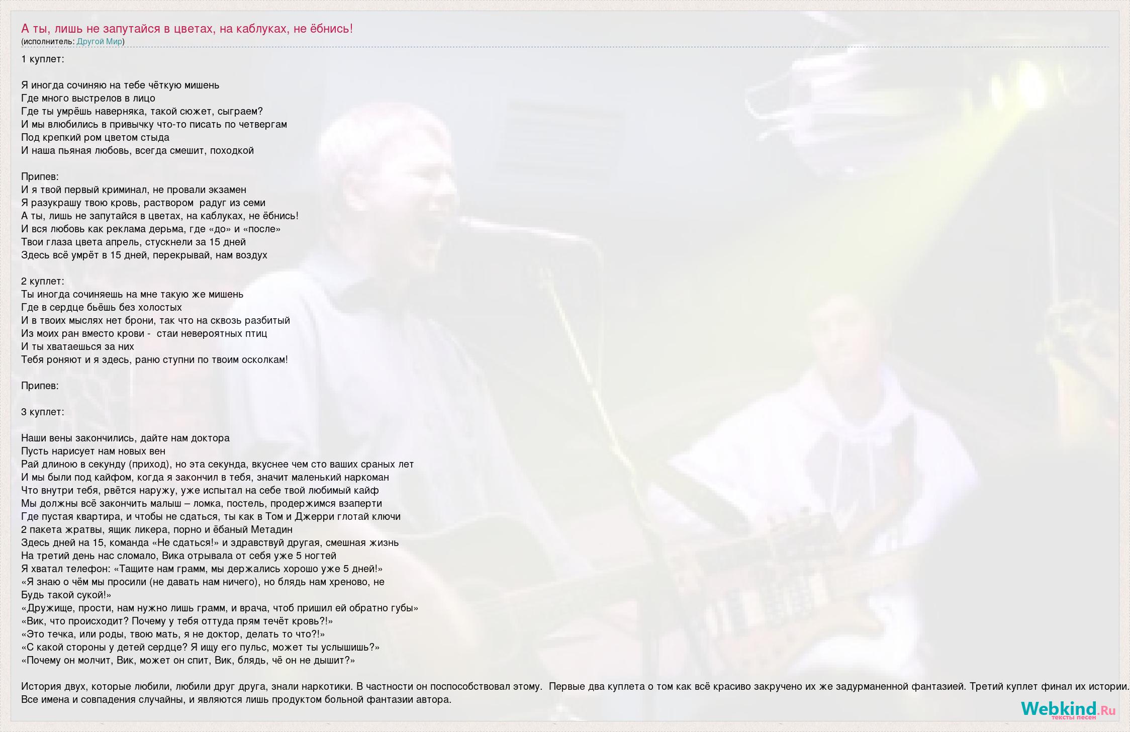 А как ты думаешь, о чем песня "А ты, лишь не запутайся в цветах, на каблуках, не ёбнись!" ?