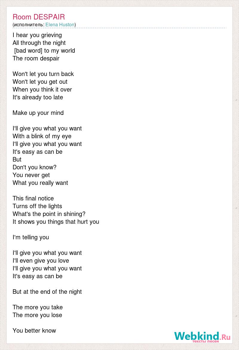 I hear you grieving All through the night [bad word] to my world The room despair Won't let you turn back Won't let you get out When you think it over It's already too late Make up your mind I'll give you what you want With a blink of my eye I'll give you what you want It's easy as can be But Don't you know? You never get What you really want This final notice Turns off the lights What's the point in shining? It shows you things that hurt you I'm telling you I'll give you what you want I'll even give you love I'll give you what you want It's easy as can be But at the end of the night The more you take The more you lose You better know