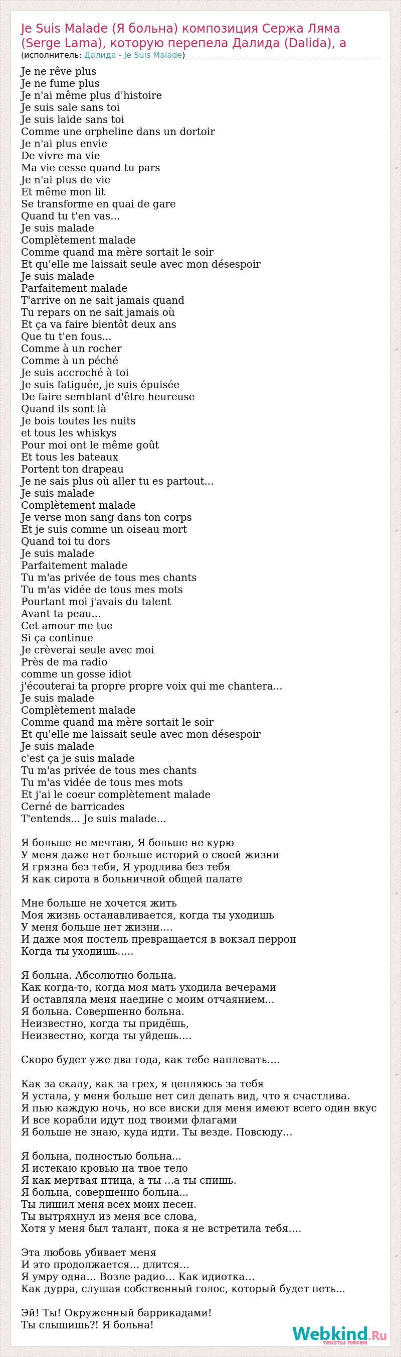 Je ne rêve plus Je ne fume plus Je n'ai même plus d'histoire Je suis sale sans toi Je suis laide sans toi Comme une orpheline dans un dortoir Je n'ai plus envie De vivre ma vie Ma vie cesse quand tu pars Je n'ai plus de vie Et même mon lit Se transforme en quai de gare Quand tu t'en vas... Je suis malade Complètement malade Comme quand ma mère sortait le soir Et qu'elle me laissait seule avec mon désespoir Je suis malade Parfaitement malade T'arrive on ne sait jamais quand Tu repars on ne sait jamais où Et ça va faire bientôt deux ans Que tu t'en fous... Comme à un rocher Comme à un péché Je suis accroché à toi Je suis fatiguée, je suis épuisée De faire semblant d'être heureuse Quand ils sont là Je bois toutes les nuits et tous les whiskys Pour moi ont le même goût Et tous les bateaux Portent ton drapeau Je ne sais plus où aller tu es partout... Je suis malade Complètement malade Je verse mon sang dans ton corps Et je suis comme un oiseau mort Quand toi tu dors Je suis malade Parfaitement malade Tu m'as privée de tous mes chants Tu m'as vidée de tous mes mots Pourtant moi j'avais du talent Avant ta peau... Cet amour me tue Si ça continue Je crèverai seule avec moi Près de ma radio comme un gosse idiot j'écouterai ta propre propre voix qui me chantera... Je suis malade Complètement malade Comme quand ma mère sortait le soir Et qu'elle me laissait seule avec mon désespoir Je suis malade c'est ça je suis malade Tu m'as privée de tous mes chants Tu m'as vidée de tous mes mots Et j'ai le coeur complètement malade Cerné de barricades T'entends... Je suis malade... Я больше не мечтаю, Я больше не курю У меня даже нет больше историй о своей жизни Я грязна без тебя, Я уродлива без тебя Я как сирота в больничной общей палате Мне больше не хочется жить Моя жизнь останавливается, когда ты уходишь У меня больше нет жизни…. И даже моя постель превращается в вокзал перрон Когда ты уходишь….. Я больна. Абсолютно больна. Как когда-то, когда моя мать уходила вечерами И оставляла меня наедине с моим отчаянием... Я больна. Совершенно больна. Неизвестно, когда ты придёшь, Неизвестно, когда ты уйдешь…. Скоро будет уже два года, как тебе наплевать…. Как за скалу, как за грех, я цепляюсь за тебя Я устала, у меня больше нет сил делать вид, что я счастлива. Я пью каждую ночь, но все виски для меня имеют всего один вкус И все корабли идут под твоими флагами Я больше не знаю, куда идти. Ты везде. Повсюду… Я больна, полностью больна... Я истекаю кровью на твое тело Я как мертвая птица, а ты ...а ты спишь. Я больна, совершенно больна... Ты лишил меня всех моих песен. Ты вытряхнул из меня все слова, Хотя у меня был талант, пока я не встретила тебя…. Эта любовь убивает меня И это продолжается… длится… Я умру одна… Возле радио… Как идиотка… Как дурра, слушая собственный голос, который будет петь... Эй! Ты! Окруженный баррикадами! Ты слышишь?! Я больна!