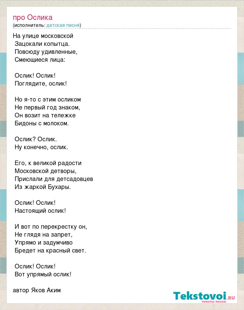 На улице московской Зацокали копытца. Повсюду удивленные, Смеющиеся лица: Ослик! Ослик! Поглядите, ослик! Но я-то с этим осликом Не первый год знаком, Он возит на тележке Бидоны с молоком. Ослик? Ослик. Ну конечно, ослик. Его, к великой радости Московской детворы, Прислали для детсадовцев Из жаркой Бухары. Ослик! Ослик! Настоящий ослик! И вот по перекрестку он, Не глядя на запрет, Упрямо и задумчиво Бредет на красный свет. Ослик! Ослик! Вот упрямый ослик! автор Яков Аким