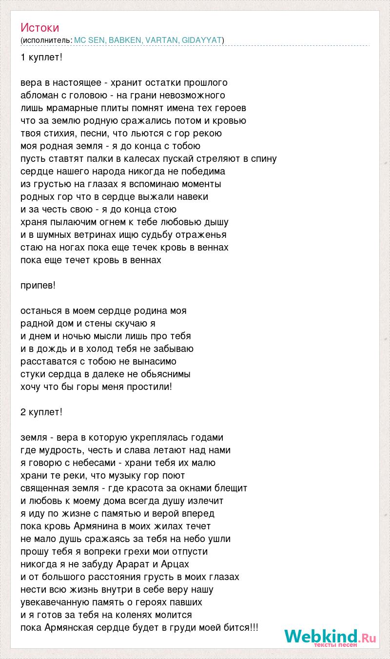 1 куплет! вера в настоящее - хранит остатки прошлого абломан с головою - на грани невозможного лишь мрамарные плиты помнят имена тех героев что за землю родную сражались потом и кровью твоя стихия, песни, что льются с гор рекою моя родная земля - я до конца с тобою пусть ставтят палки в калесах пускай стреляют в спину сердце нашего народа никогда не победима из грустью на глазах я вспоминаю моменты родных гор что в сердце выжали навеки и за честь свою - я до конца стою храня пылаючим огнем к тебе любовью дышу и в шумных ветринах ищю судьбу отраженья стаю на ногах пока еще течек кровь в веннах пока еще течет кровь в веннах припев! останься в моем сердце родина моя радной дом и стены скучаю я и днем и ночью мысли лишь про тебя и в дождь и в холод тебя не забываю расставатся с тобою не вынасимо стуки сердца в далеке не обьяснимы хочу что бы горы меня простили! 2 куплет! земля - вера в которую укреплялась годами где мудрость, честь и слава летают над нами я говорю с небесами - храни тебя их малю храни те реки, что музыку гор поют священная земля - где красота за окнами блещит и любовь к моему дома всегда душу излечит я иду по жизне с памятью и верой вперед пока кровь Армянина в моих жилах течет не мало душь сражаясь за тебя на небо ушли прошу тебя я вопреки грехи мои отпусти никогда я не забуду Арарат и Арцах и от большого расстояния грусть в моих глазах нести всю жизнь внутри в себе веру нашу увекавечанную память о героях павших и я готов за тебя на коленях молится пока Армянская сердце будет в груди моей бится!!!