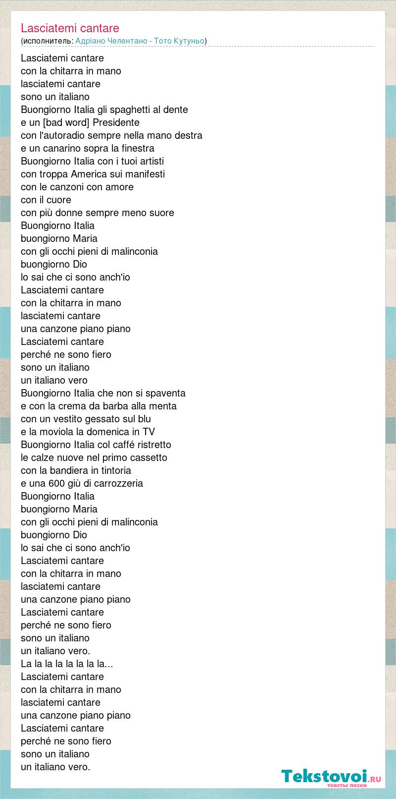 Lasciatemi cantare con la chitarra in mano lasciatemi cantare sono un italiano Buongiorno Italia gli spaghetti al dente e un partigiano come Presidente con l'autoradio sempre nella mano destra e un canarino sopra la finestra Buongiorno Italia con i tuoi artisti con troppa America sui manifesti con le canzoni con amore con il cuore con più donne sempre meno suore Buongiorno Italia buongiorno Maria con gli occhi pieni di malinconia buongiorno Dio lo sai che ci sono anch'io Lasciatemi cantare con la chitarra in mano lasciatemi cantare una canzone piano piano Lasciatemi cantare perché ne sono fiero sono un italiano un italiano vero Buongiorno Italia che non si spaventa e con la crema da barba alla menta con un vestito gessato sul blu e la moviola la domenica in TV Buongiorno Italia col caffé ristretto le calze nuove nel primo cassetto con la bandiera in tintoria e una 600 giù di carrozzeria Buongiorno Italia buongiorno Maria con gli occhi pieni di malinconia buongiorno Dio lo sai che ci sono anch'io Lasciatemi cantare con la chitarra in mano lasciatemi cantare una canzone piano piano Lasciatemi cantare perché ne sono fiero sono un italiano un italiano vero. La la la la la la la la... Lasciatemi cantare con la chitarra in mano lasciatemi cantare una canzone piano piano Lasciatemi cantare perché ne sono fiero sono un italiano un italiano vero.