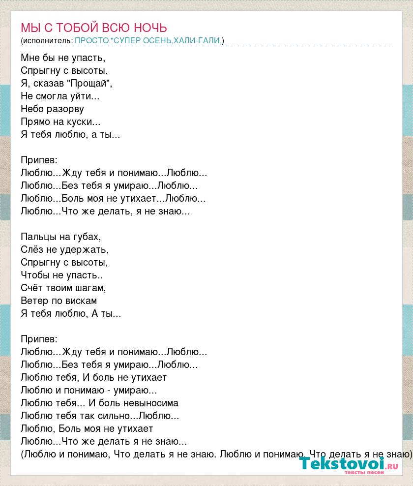 Мне бы не упасть, Спрыгну с высоты. Я, сказав "Прощай", Не смогла уйти... Небо разорву Прямо на куски... Я тебя люблю, а ты... Припев: Люблю...Жду тебя и понимаю...Люблю... Люблю...Без тебя я умираю...Люблю... Люблю...Боль моя не утихает...Люблю... Люблю...Что же делать, я не знаю... Пальцы на губах, Слёз не удержать, Спрыгну с высоты, Чтобы не упасть.. Счёт твоим шагам, Ветер по вискам Я тебя люблю, А ты... Припев: Люблю...Жду тебя и понимаю...Люблю... Люблю...Без тебя я умираю...Люблю... Люблю тебя, И боль не утихает Люблю и понимаю - умираю... Люблю тебя... И боль невыносима Люблю тебя так сильно...Люблю... Люблю, Боль моя не утихает Люблю...Что же делать я не знаю... (Люблю и понимаю, Что делать я не знаю. Люблю и понимаю, Что делать я не знаю)