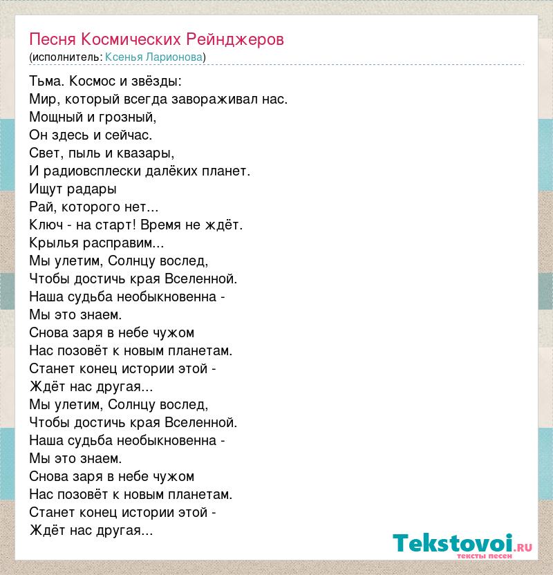 Тьма. Космос и звёзды: Мир, который всегда завораживал нас. Мощный и грозный, Он здесь и сейчас. Свет, пыль и квазары, И радиовсплески далёких планет. Ищут радары Рай, которого нет... Ключ - на старт! Время не ждёт. Крылья расправим... Мы улетим, Солнцу вослед, Чтобы достичь края Вселенной. Наша судьба необыкновенна - Мы это знаем. Снова заря в небе чужом Нас позовёт к новым планетам. Станет конец истории этой - Ждёт нас другая... Мы улетим, Солнцу вослед, Чтобы достичь края Вселенной. Наша судьба необыкновенна - Мы это знаем. Снова заря в небе чужом Нас позовёт к новым планетам. Станет конец истории этой - Ждёт нас другая...
