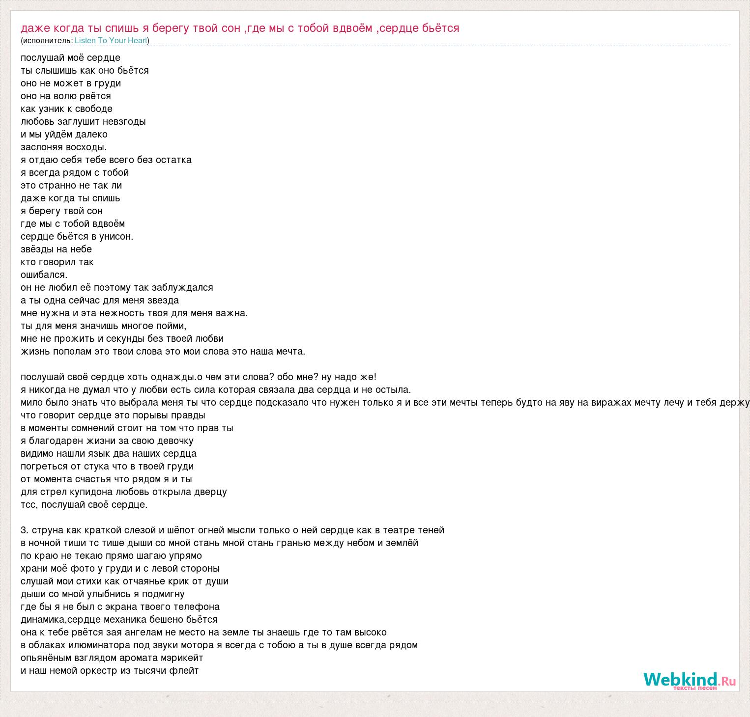 послушай моё сердце ты слышишь как оно бьётся оно не может в груди оно на волю рвётся как узник к свободе любовь заглушит невзгоды и мы уйдём далеко заслоняя восходы. я отдаю себя тебе всего без остатка я всегда рядом с тобой это странно не так ли даже когда ты спишь я берегу твой сон где мы с тобой вдвоём сердце бьётся в унисон. звёзды на небе кто говорил так ошибался. он не любил её поэтому так заблуждался а ты одна сейчас для меня звезда мне нужна и эта нежность твоя для меня важна. ты для меня значишь многое пойми, мне не прожить и секунды без твоей любви жизнь пополам это твои слова это мои слова это наша мечта. послушай своё сердце хоть однажды.о чем эти слова? обо мне? ну надо же! я никогда не думал что у любви есть сила которая связала два сердца и не остыла. мило было знать что выбрала меня ты что сердце подсказало что нужен только я и все эти мечты теперь будто на яву на виражах мечту лечу и тебя держу что говорит сердце это порывы правды в моменты сомнений стоит на том что прав ты я благодарен жизни за свою девочку видимо нашли язык два наших сердца погреться от стука что в твоей груди от момента счастья что рядом я и ты для стрел купидона любовь открыла дверцу тсс, послушай своё сердце. 3. струна как краткой слезой и шёпот огней мысли только о ней сердце как в театре теней в ночной тиши тс тише дыши со мной стань мной стань гранью между небом и землёй по краю не текаю прямо шагаю упрямо храни моё фото у груди и с левой стороны слушай мои стихи как отчаянье крик от души дыши со мной улыбнись я подмигну где бы я не был с экрана твоего телефона динамика,сердце механика бешено бьётся она к тебе рвётся зая ангелам не место на земле ты знаешь где то там высоко в облаках илюминатора под звуки мотора я всегда с тобою а ты в душе всегда рядом опьянёным взглядом аромата мэрикейт и наш немой оркестр из тысячи флейт