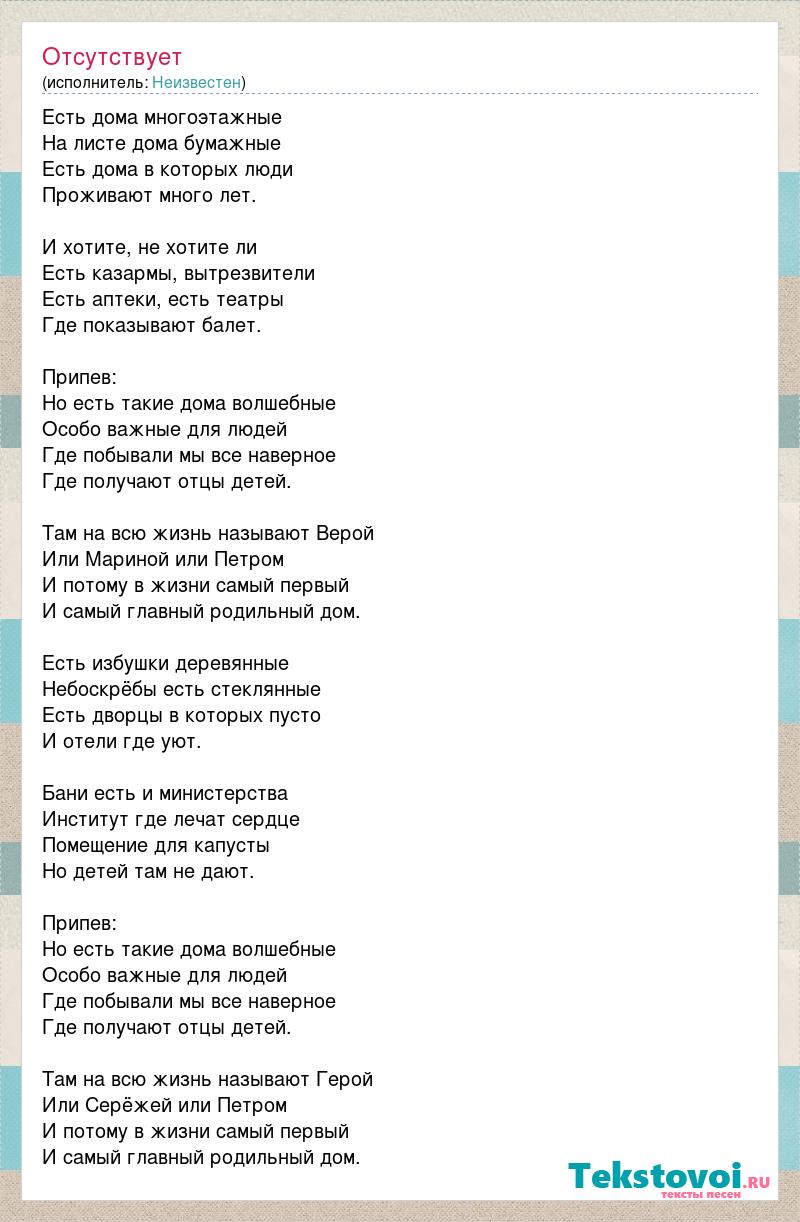 Есть дома многоэтажные На листе дома бумажные Есть дома в которых люди Проживают много лет. И хотите, не хотите ли Есть казармы, вытрезвители Есть аптеки, есть театры Где показывают балет. Припев: Но есть такие дома волшебные Особо важные для людей Где побывали мы все наверное Где получают отцы детей. Там на всю жизнь называют Верой Или Мариной или Петром И потому в жизни самый первый И самый главный родильный дом. Есть избушки деревянные Небоскрёбы есть стеклянные Есть дворцы в которых пусто И отели где уют. Бани есть и министерства Институт где лечат сердце Помещение для капусты Но детей там не дают. Припев: Но есть такие дома волшебные Особо важные для людей Где побывали мы все наверное Где получают отцы детей. Там на всю жизнь называют Герой Или Серёжей или Петром И потому в жизни самый первый И самый главный родильный дом.