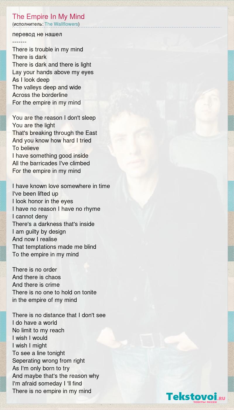 перевод не нашел ------- There is trouble in my mind There is dark There is dark and there is light Lay your hands above my eyes As I look deep The valleys deep and wide Across the borderline For the empire in my mind You are the reason I don't sleep You are the light That's breaking through the East And you know how hard I tried To believe I have something good inside All the barricades I've climbed For the empire in my mind I have known love somewhere in time I've been lifted up I look honor in the eyes I have no reason I have no rhyme I cannot deny There's a darkness that's inside I am guilty by design And now I realise That temptations made me blind To the empire in my mind There is no order And there is chaos And there is crime There is no one to hold on tonite in the empire of my mind There is no distance that I don't see I do have a world No limit to my reach I wish I would I wish I might To see a line tonight Seperating wrong from right As I'm only born to try And maybe that's the reason why I'm afraid someday I 'll find There is no empire in my mind