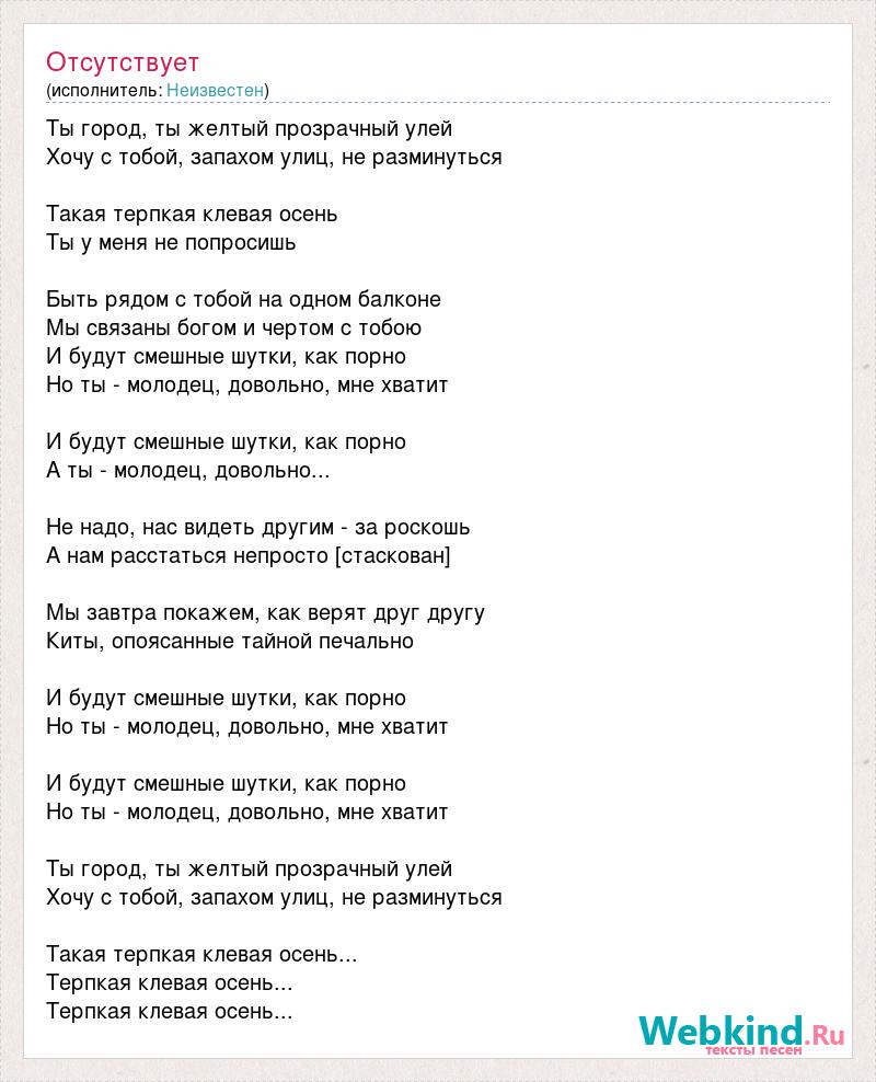 Ты город, ты желтый прозрачный улей Хочу с тобой, запахом улиц, не разминуться Такая терпкая клевая осень Ты у меня не попросишь Быть рядом с тобой на одном балконе Мы связаны богом и чертом с тобою И будут смешные шутки, как порно Но ты - молодец, довольно, мне хватит И будут смешные шутки, как порно А ты - молодец, довольно... Не надо, нас видеть другим - за роскошь А нам расстаться непросто [стаскован] Мы завтра покажем, как верят друг другу Киты, опоясанные тайной печально И будут смешные шутки, как порно Но ты - молодец, довольно, мне хватит И будут смешные шутки, как порно Но ты - молодец, довольно, мне хватит Ты город, ты желтый прозрачный улей Хочу с тобой, запахом улиц, не разминуться Такая терпкая клевая осень... Терпкая клевая осень... Терпкая клевая осень...
