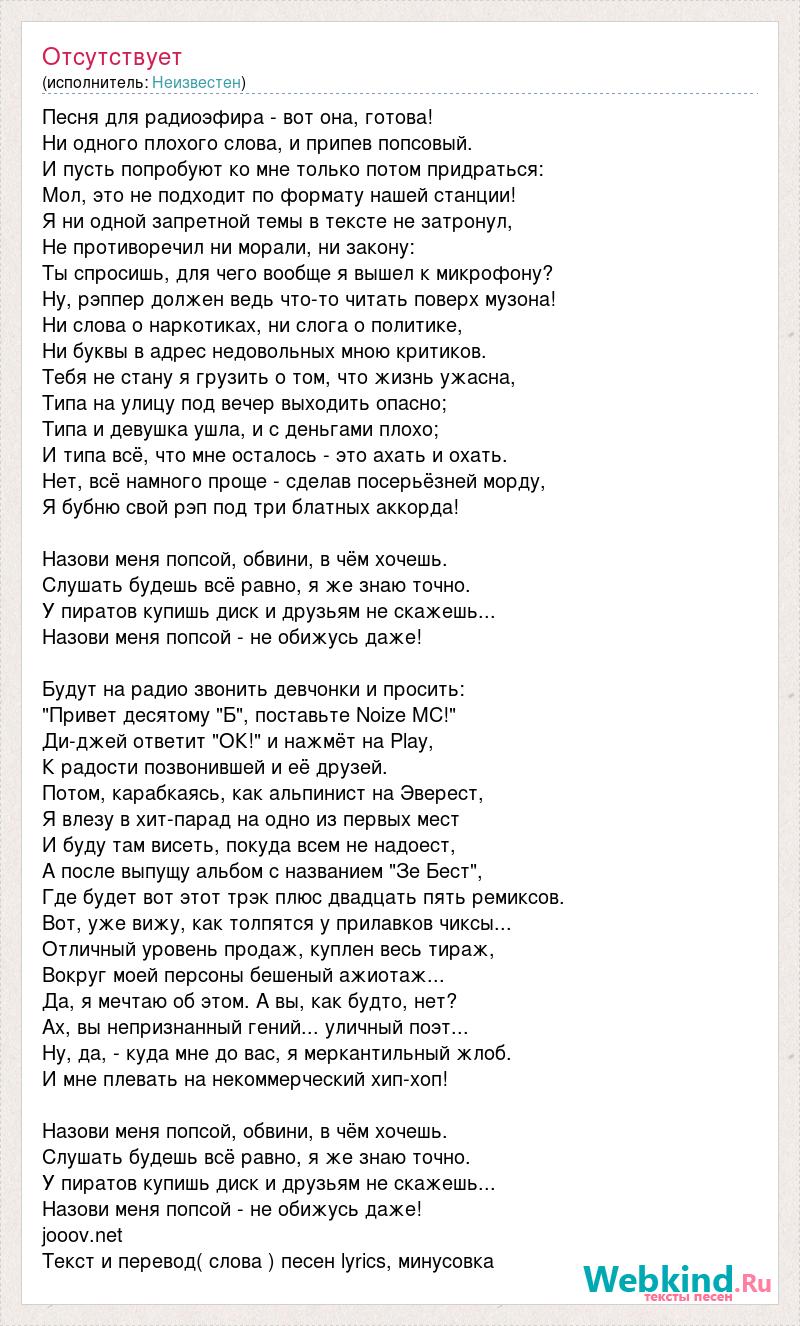 Песня для радиоэфира - вот она, готова! Ни одного плохого слова, и припев попсовый. И пусть попробуют ко мне только потом придраться: Мол, это не подходит по формату нашей станции! Я ни одной запретной темы в тексте не затронул, Не противоречил ни морали, ни закону: Ты спросишь, для чего вообще я вышел к микрофону? Ну, рэппер должен ведь что-то читать поверх музона! Ни слова о наркотиках, ни слога о политике, Ни буквы в адрес недовольных мною критиков. Тебя не стану я грузить о том, что жизнь ужасна, Типа на улицу под вечер выходить опасно; Типа и девушка ушла, и с деньгами плохо; И типа всё, что мне осталось - это ахать и охать. Нет, всё намного проще - сделав посерьёзней морду, Я бубню свой рэп под три блатных аккорда! Назови меня попсой, обвини, в чём хочешь. Слушать будешь всё равно, я же знаю точно. У пиратов купишь диск и друзьям не скажешь... Назови меня попсой - не обижусь даже! Будут на радио звонить девчонки и просить: "Привет десятому "Б", поставьте Noize MC!" Ди-джей ответит "ОК!" и нажмёт на Play, К радости позвонившей и её друзей. Потом, карабкаясь, как альпинист на Эверест, Я влезу в хит-парад на одно из первых мест И буду там висеть, покуда всем не надоест, А после выпущу альбом с названием "Зе Бест", Где будет вот этот трэк плюс двадцать пять ремиксов. Вот, уже вижу, как толпятся у прилавков чиксы... Отличный уровень продаж, куплен весь тираж, Вокруг моей персоны бешеный ажиотаж... Да, я мечтаю об этом. А вы, как будто, нет? Ах, вы непризнанный гений... уличный поэт... Ну, да, - куда мне до вас, я меркантильный жлоб. И мне плевать на некоммерческий хип-хоп! Назови меня попсой, обвини, в чём хочешь. Слушать будешь всё равно, я же знаю точно. У пиратов купишь диск и друзьям не скажешь... Назови меня попсой - не обижусь даже! jooov.net Текст и перевод( слова ) песен lyrics, минусовка