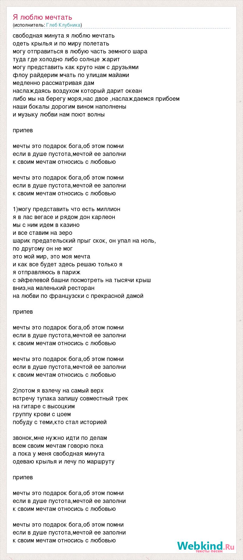 свободная минута я люблю мечтать одеть крылья и по миру полетать могу отправиться в любую часть земного шара туда где холодно либо солнце жарит могу представить как круто нам с друзьями флоу райдерим мчать по улицам майами медленно рассматривая дам наслаждаясь воздухом который дарит океан либо мы на берегу моря,нас двое ,наслаждаемся прибоем наши бокалы дорогим вином наполнены и музыку любви нам поют волны припев мечты это подарок бога,об этом помни если в душе пустота,мечтой ее заполни к своим мечтам относись с любовью мечты это подарок бога,об этом помни если в душе пустота,мечтой ее заполни к своим мечтам относись с любовью 1)могу представить что есть миллион я в лас вегасе и рядом дон карлеон мы с ним идем в казино и все ставим на зеро шарик предательский прыг скок, он упал на ноль, по другому он не мог это мой мир, это моя мечта и как все будет здесь решаю только я я отправляюсь в париж с эйфелевой башни посмотреть на тысячи крыш вниз,на маленький ресторан на любви по французски с прекрасной дамой припев мечты это подарок бога,об этом помни если в душе пустота,мечтой ее заполни к своим мечтам относись с любовью мечты это подарок бога,об этом помни если в душе пустота,мечтой ее заполни к своим мечтам относись с любовью 2)потом я взлечу на самый верх встречу тупака запишу совместный трек на гитаре с высоцким группу крови с цоем побуду с теми,кто стал историей звонок,мне нужно идти по делам всем своим мечтам говорю пока а пока у меня свободная минута одеваю крылья и лечу по маршруту припев мечты это подарок бога,об этом помни если в душе пустота,мечтой ее заполни к своим мечтам относись с любовью мечты это подарок бога,об этом помни если в душе пустота,мечтой ее заполни к своим мечтам относись с любовью