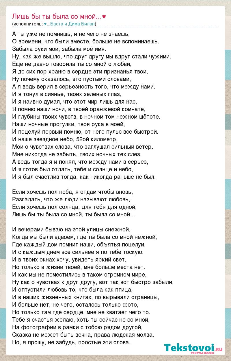 А ты уже не помнишь, и не чего не знаешь, О времени, что были вместе, больше не вспоминаешь. Забыла руки мои, забыла моё имя. Ну, как же вышло, что друг другу мы вдруг стали чужими. Еще не давно говорила ты со мной о любви, Я до сих пор храню в сердце эти признанья твои, Ну почему оказалось, это пустыми словами, А я ведь верил в серьезность того, что между нами. И я тонул в сиянье, твоих зеленых глаз, И я наивно думал, что этот мир лишь для нас, Я помню наши ночи, в твоей оранжевой комнате, И глубины твоих чувств, в ночном том нежном шёпоте. Наши ночные прогулки, твоя рука в моей, И поцелуй первый помню, от него пульс все быстрей. И наше звездное небо, 52ой километр, Мои о чувствах слова, что заглушал сильный ветер. Мне никогда не забыть, твоих ночных тех слез, А ведь тогда я и понял, что между нами в серьез, И я готов был отдать, тебе и солнце и небо, И я был счастлив тогда, как никогда раньше не был. Если хочешь пол неба, я отдам чтобы вновь, Разгадать, что же люди называют любовь, Если хочешь пол солнца, для тебя для одной, Лишь бы ты была со мной, ты была со мной… И вечерами бываю на этой улицы снежной, Когда мы были вдвоем, где ты была со мной нежной, Где каждый дом помнит наши, объятья поцелуи, И с каждым днем все сильнее я по тебе тоскую. И в твоих окнах хочу, увидеть яркий свет, Но только в жизни твоей, мне больше места нет. И как мы не поместились в таком огромном мире, Ну как о чувствах к друг другу, вот так вот быстро забыли. И отпустили любовь то, что была как птица, И в наших жизненных книгах, по вырывали страницы, И больше нет, не чего, осталось только фото, Но только там где сердце, мне не хватает чего то. Тебе я счастья желаю, хоть ты сейчас не со мной, На фотографии в рамки с тобою рядом другой, Сказка не может быть вечна, права людская молва, Но, я прошу, не забудь, простые эти слова.