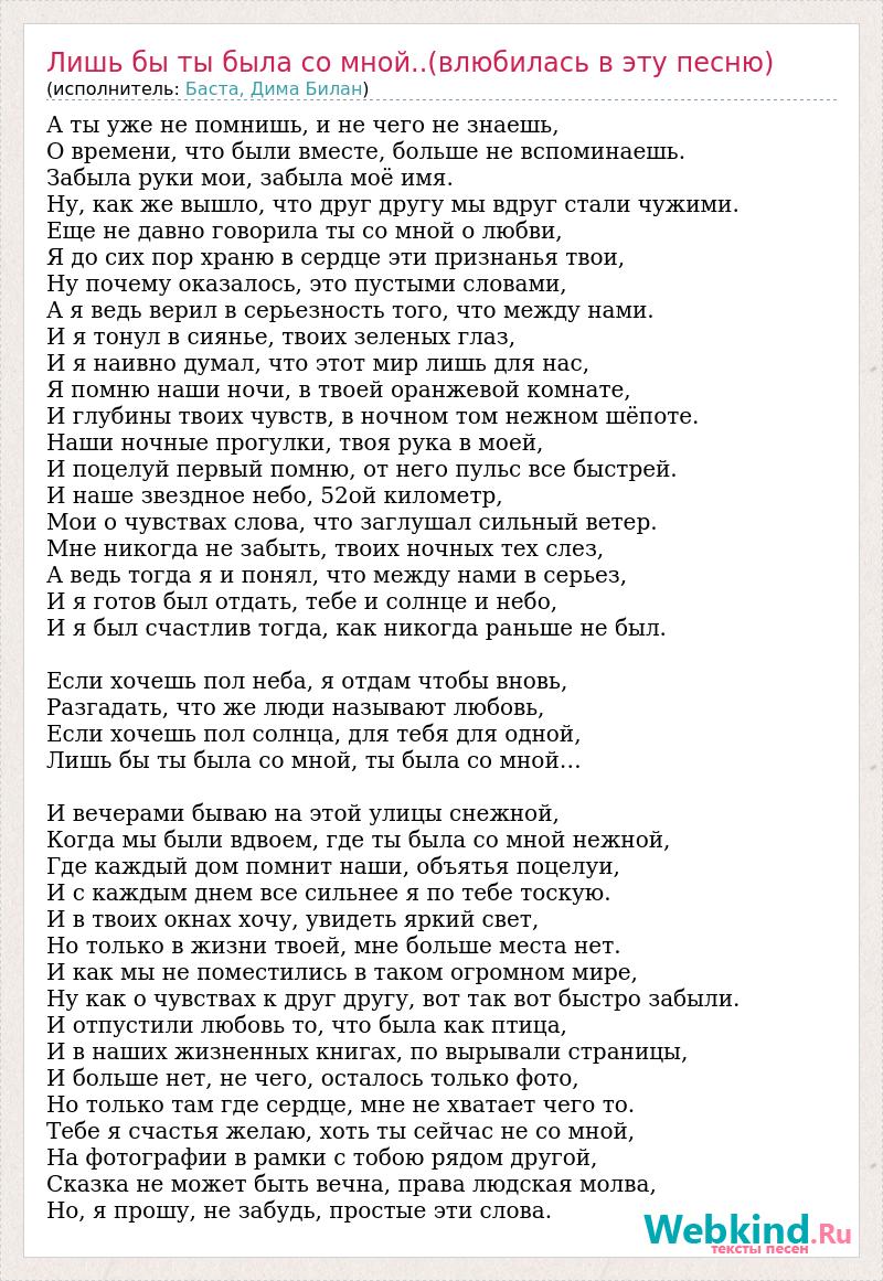А ты уже не помнишь, и не чего не знаешь, О времени, что были вместе, больше не вспоминаешь. Забыла руки мои, забыла моё имя. Ну, как же вышло, что друг другу мы вдруг стали чужими. Еще не давно говорила ты со мной о любви, Я до сих пор храню в сердце эти признанья твои, Ну почему оказалось, это пустыми словами, А я ведь верил в серьезность того, что между нами. И я тонул в сиянье, твоих зеленых глаз, И я наивно думал, что этот мир лишь для нас, Я помню наши ночи, в твоей оранжевой комнате, И глубины твоих чувств, в ночном том нежном шёпоте. Наши ночные прогулки, твоя рука в моей, И поцелуй первый помню, от него пульс все быстрей. И наше звездное небо, 52ой километр, Мои о чувствах слова, что заглушал сильный ветер. Мне никогда не забыть, твоих ночных тех слез, А ведь тогда я и понял, что между нами в серьез, И я готов был отдать, тебе и солнце и небо, И я был счастлив тогда, как никогда раньше не был. Если хочешь пол неба, я отдам чтобы вновь, Разгадать, что же люди называют любовь, Если хочешь пол солнца, для тебя для одной, Лишь бы ты была со мной, ты была со мной… И вечерами бываю на этой улицы снежной, Когда мы были вдвоем, где ты была со мной нежной, Где каждый дом помнит наши, объятья поцелуи, И с каждым днем все сильнее я по тебе тоскую. И в твоих окнах хочу, увидеть яркий свет, Но только в жизни твоей, мне больше места нет. И как мы не поместились в таком огромном мире, Ну как о чувствах к друг другу, вот так вот быстро забыли. И отпустили любовь то, что была как птица, И в наших жизненных книгах, по вырывали страницы, И больше нет, не чего, осталось только фото, Но только там где сердце, мне не хватает чего то. Тебе я счастья желаю, хоть ты сейчас не со мной, На фотографии в рамки с тобою рядом другой, Сказка не может быть вечна, права людская молва, Но, я прошу, не забудь, простые эти слова.