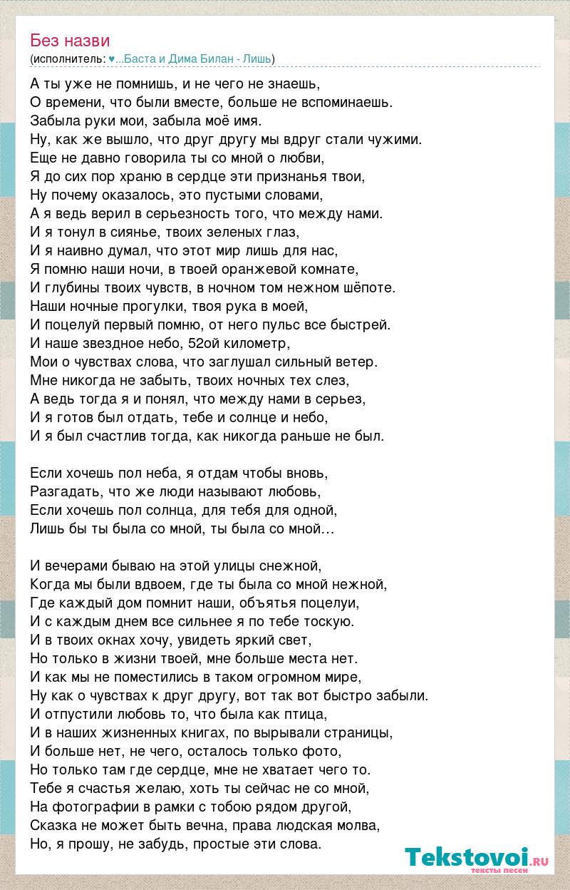 А ты уже не помнишь, и не чего не знаешь, О времени, что были вместе, больше не вспоминаешь. Забыла руки мои, забыла моё имя. Ну, как же вышло, что друг другу мы вдруг стали чужими. Еще не давно говорила ты со мной о любви, Я до сих пор храню в сердце эти признанья твои, Ну почему оказалось, это пустыми словами, А я ведь верил в серьезность того, что между нами. И я тонул в сиянье, твоих зеленых глаз, И я наивно думал, что этот мир лишь для нас, Я помню наши ночи, в твоей оранжевой комнате, И глубины твоих чувств, в ночном том нежном шёпоте. Наши ночные прогулки, твоя рука в моей, И поцелуй первый помню, от него пульс все быстрей. И наше звездное небо, 52ой километр, Мои о чувствах слова, что заглушал сильный ветер. Мне никогда не забыть, твоих ночных тех слез, А ведь тогда я и понял, что между нами в серьез, И я готов был отдать, тебе и солнце и небо, И я был счастлив тогда, как никогда раньше не был. Если хочешь пол неба, я отдам чтобы вновь, Разгадать, что же люди называют любовь, Если хочешь пол солнца, для тебя для одной, Лишь бы ты была со мной, ты была со мной… И вечерами бываю на этой улицы снежной, Когда мы были вдвоем, где ты была со мной нежной, Где каждый дом помнит наши, объятья поцелуи, И с каждым днем все сильнее я по тебе тоскую. И в твоих окнах хочу, увидеть яркий свет, Но только в жизни твоей, мне больше места нет. И как мы не поместились в таком огромном мире, Ну как о чувствах к друг другу, вот так вот быстро забыли. И отпустили любовь то, что была как птица, И в наших жизненных книгах, по вырывали страницы, И больше нет, не чего, осталось только фото, Но только там где сердце, мне не хватает чего то. Тебе я счастья желаю, хоть ты сейчас не со мной, На фотографии в рамки с тобою рядом другой, Сказка не может быть вечна, права людская молва, Но, я прошу, не забудь, простые эти слова.